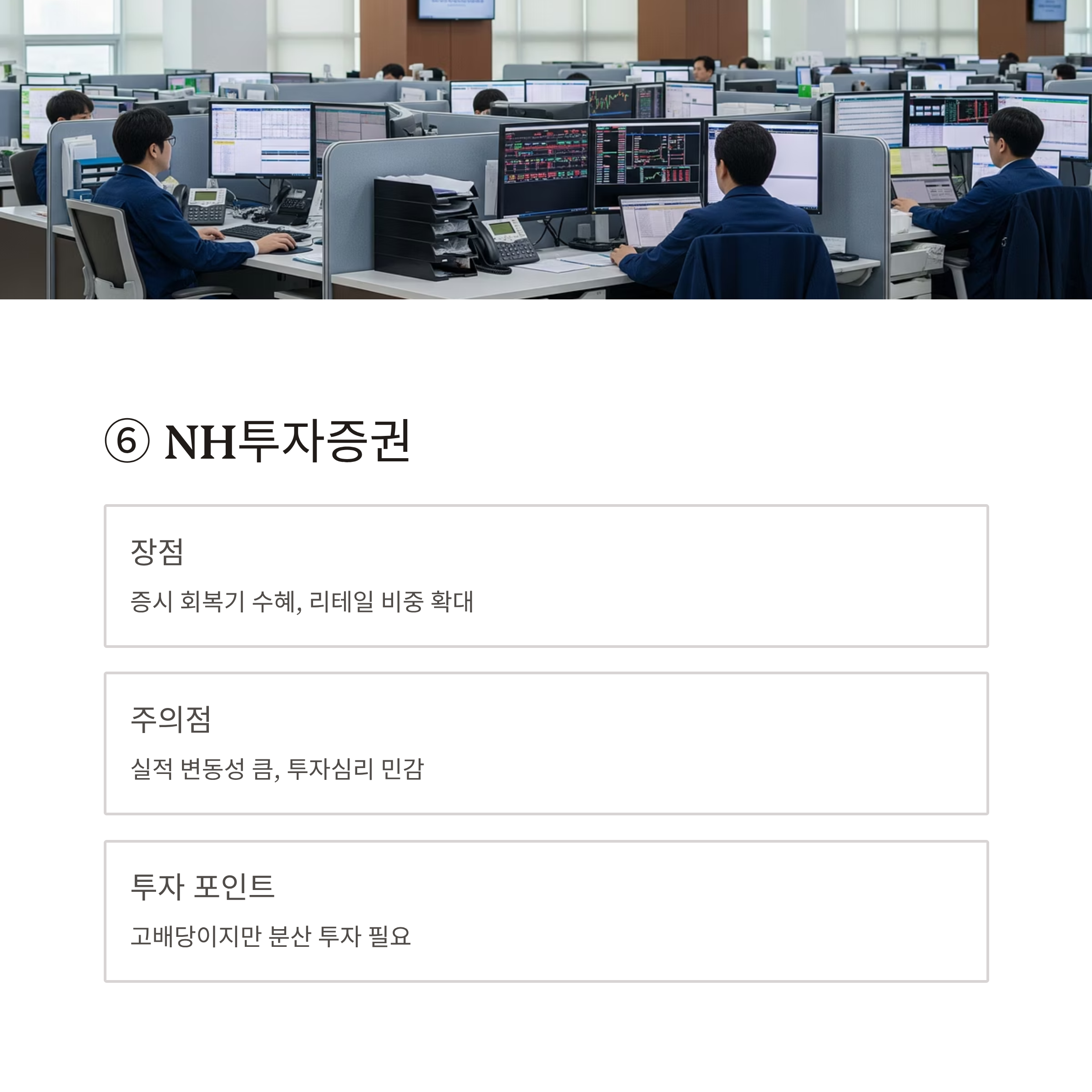 | NH투자증권 | 약 6.0% | 증권업 + 배당 성장 기대감 공존, 금융시장 민감도 주의 | 약 6~8% |