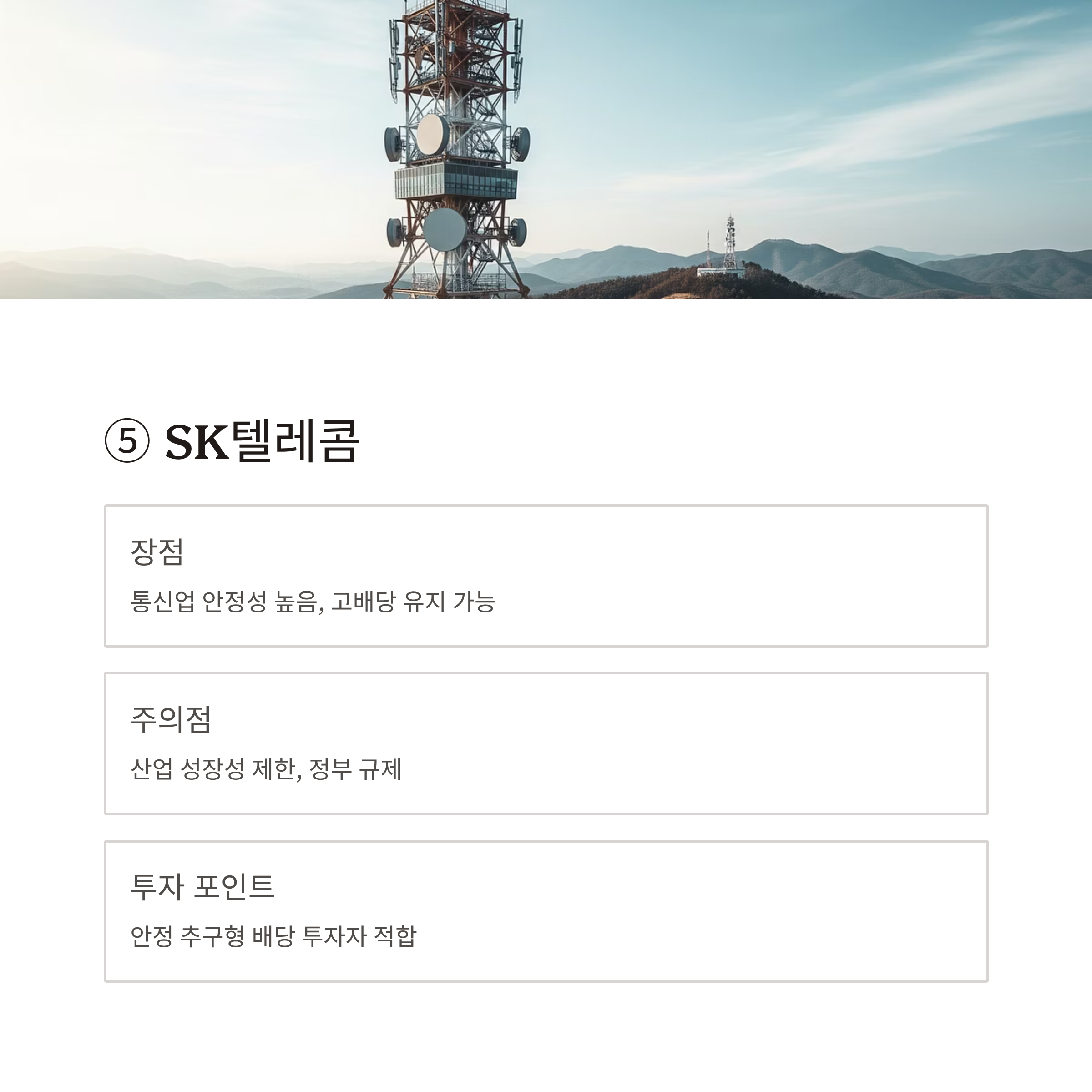 | SK텔레콤 | 통신서비스 안정적, 데이터센터·AI 등 신사업 진출 확대 | DPS 약 3,540원 (2024 기준) | 성장성은 제한적, 연 5~7% 범위 예상 |