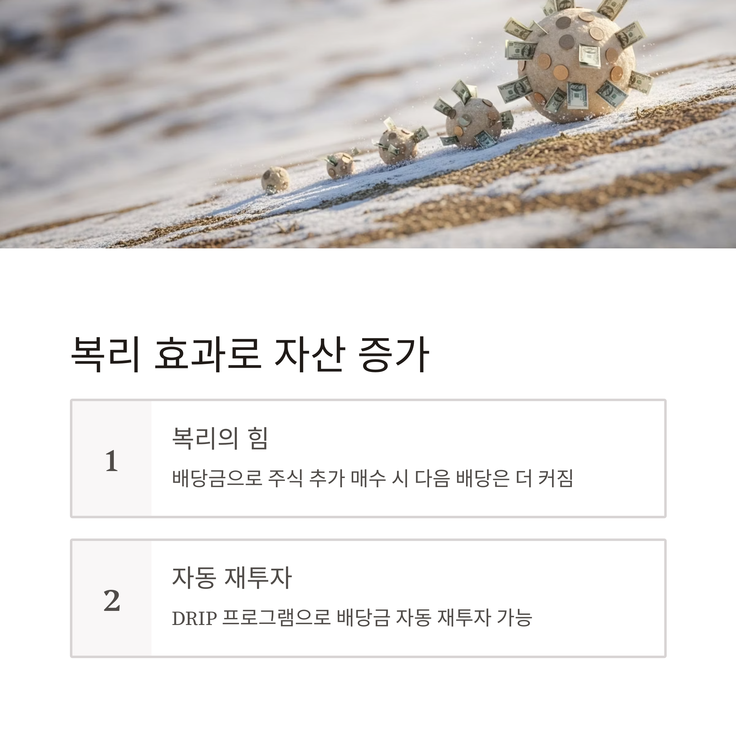 ETF나 일부 브로커에서는 DRIP(배당 재투자 자동 프로그램)을 통해 손쉽게 실현할 수 있습니다.