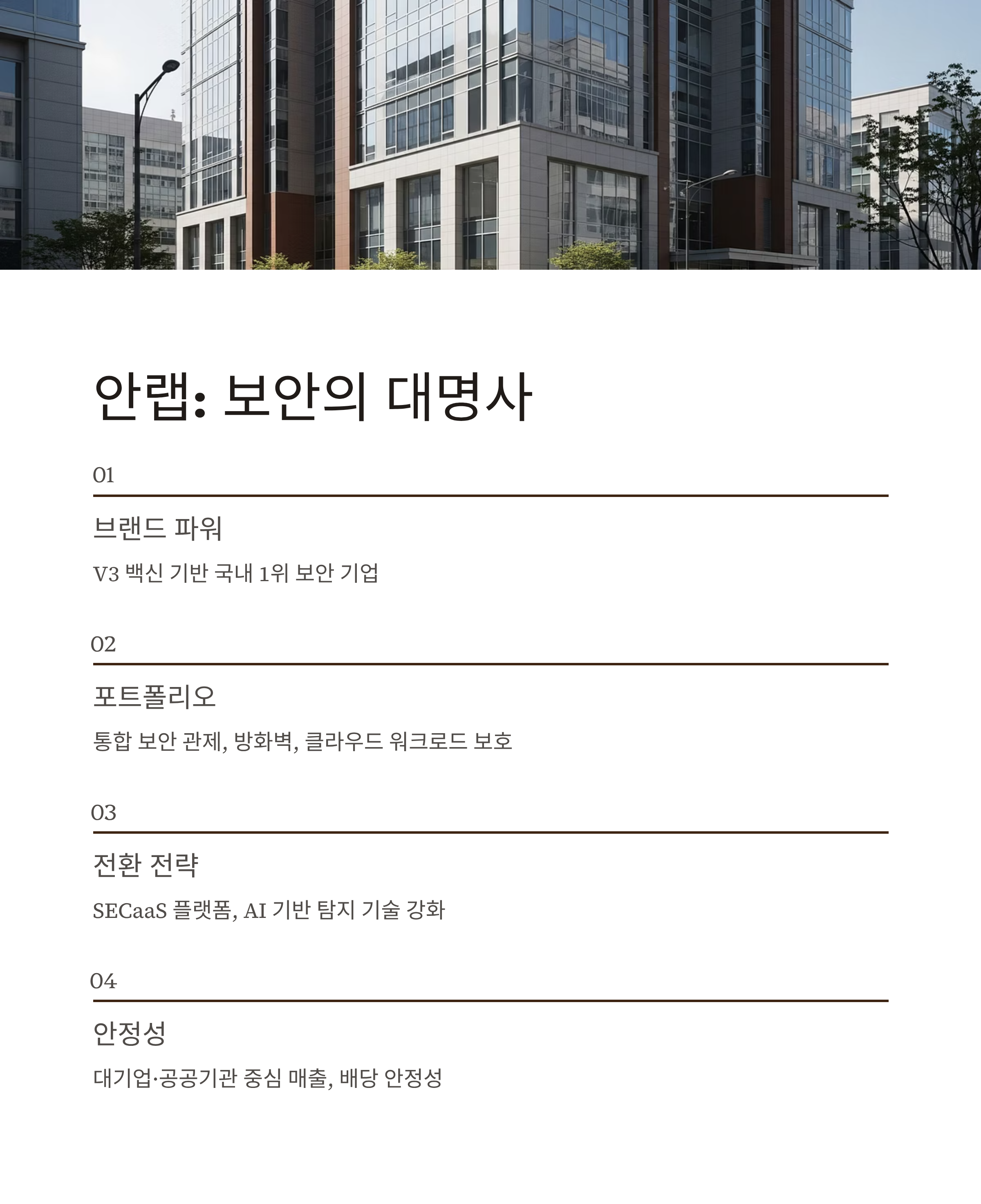 안랩은 국내 보안 시장을 대표하는 ‘브랜드 파워’와 ‘기술력’을 동시에 갖춘 기업입니다. 대표 솔루션인 V3 백신 외에도 통합 보안 관제, 방화벽, 네트워크 보안, 클라우드 워크로드 보호까지 폭넓은 포트폴리오를 운영 중입니다.