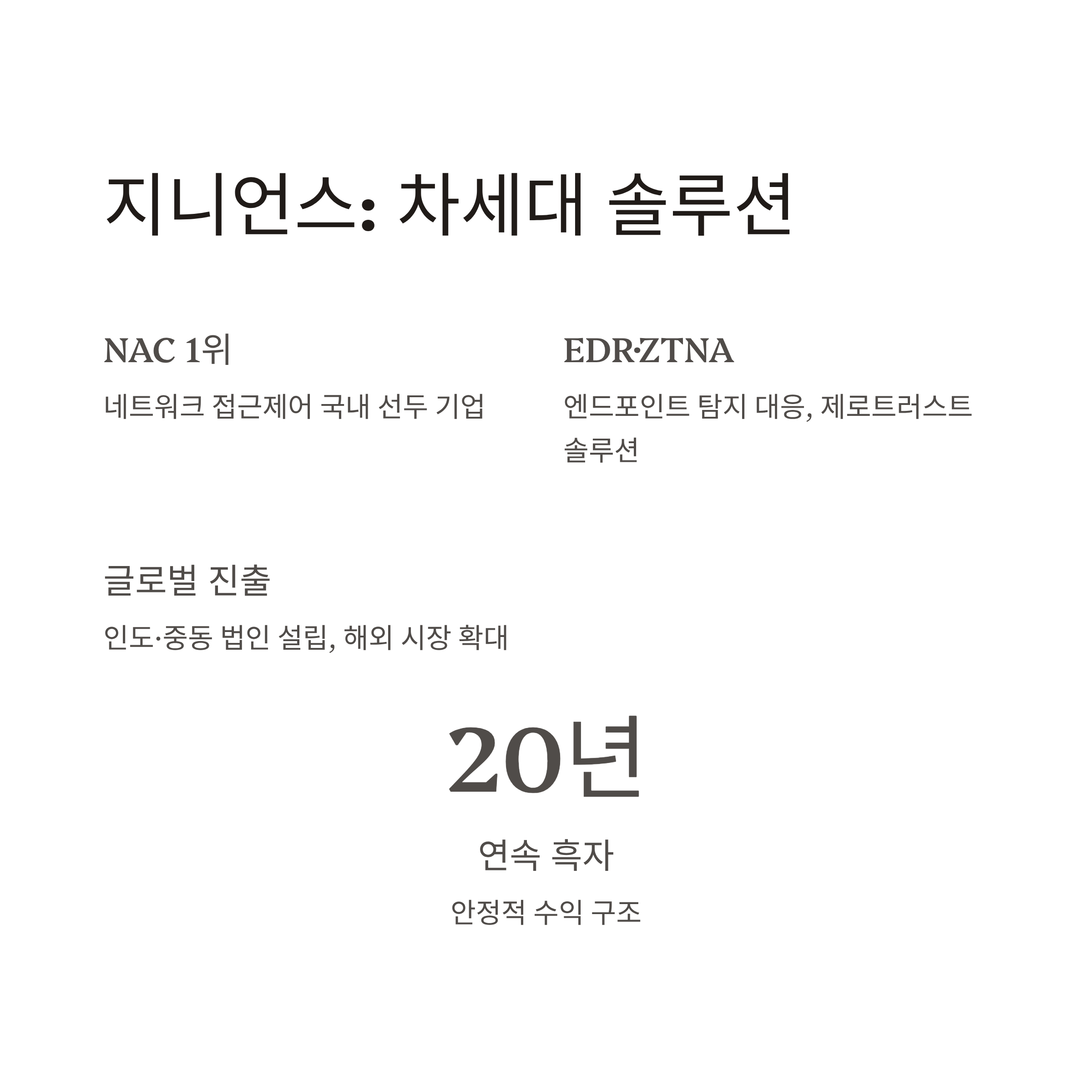 국내 NAC 분야 1위 기업으로 자리매김하고 있으며, 20년 연속 흑자, 공공·금융·엔터프라이즈 고객 기반, 클라우드 전환형 제품 확대 등에서 높은 평가를 받고 있습니다.
