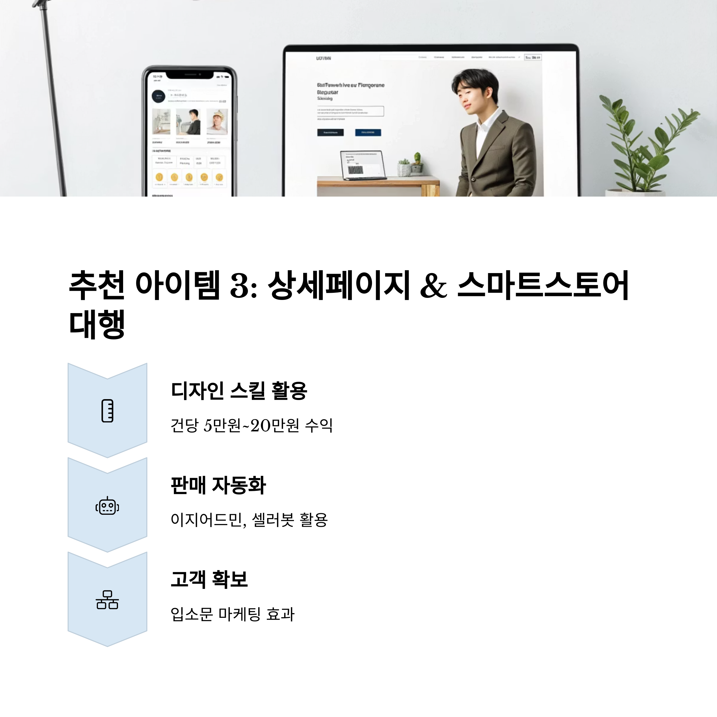 전자책 제작, 템플릿 판매, 상세페이지 대행, 스마트스토어 리스팅 등 작업 단위가 명확하고 자동화 가능한 일이 적합합니다.