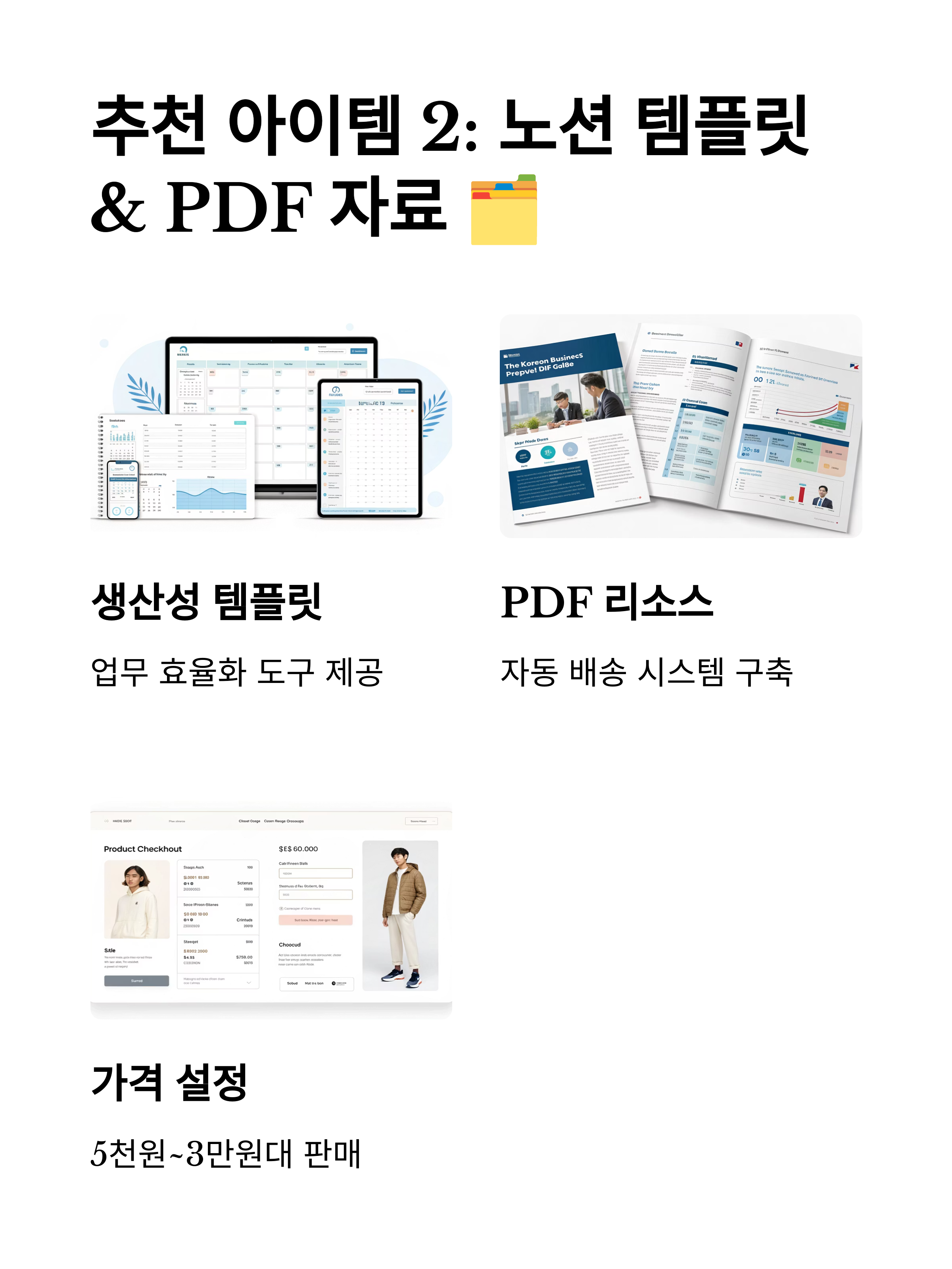 | 경험 기반 콘텐츠로 PDF 제작 후 반복 판매 | 업무 도구, 체크리스트, 노션템플릿 등 자동 다운로드형 구성 | 상세페이지, 상품 등록, 디자인 등 단기 대행 업무 위주 |