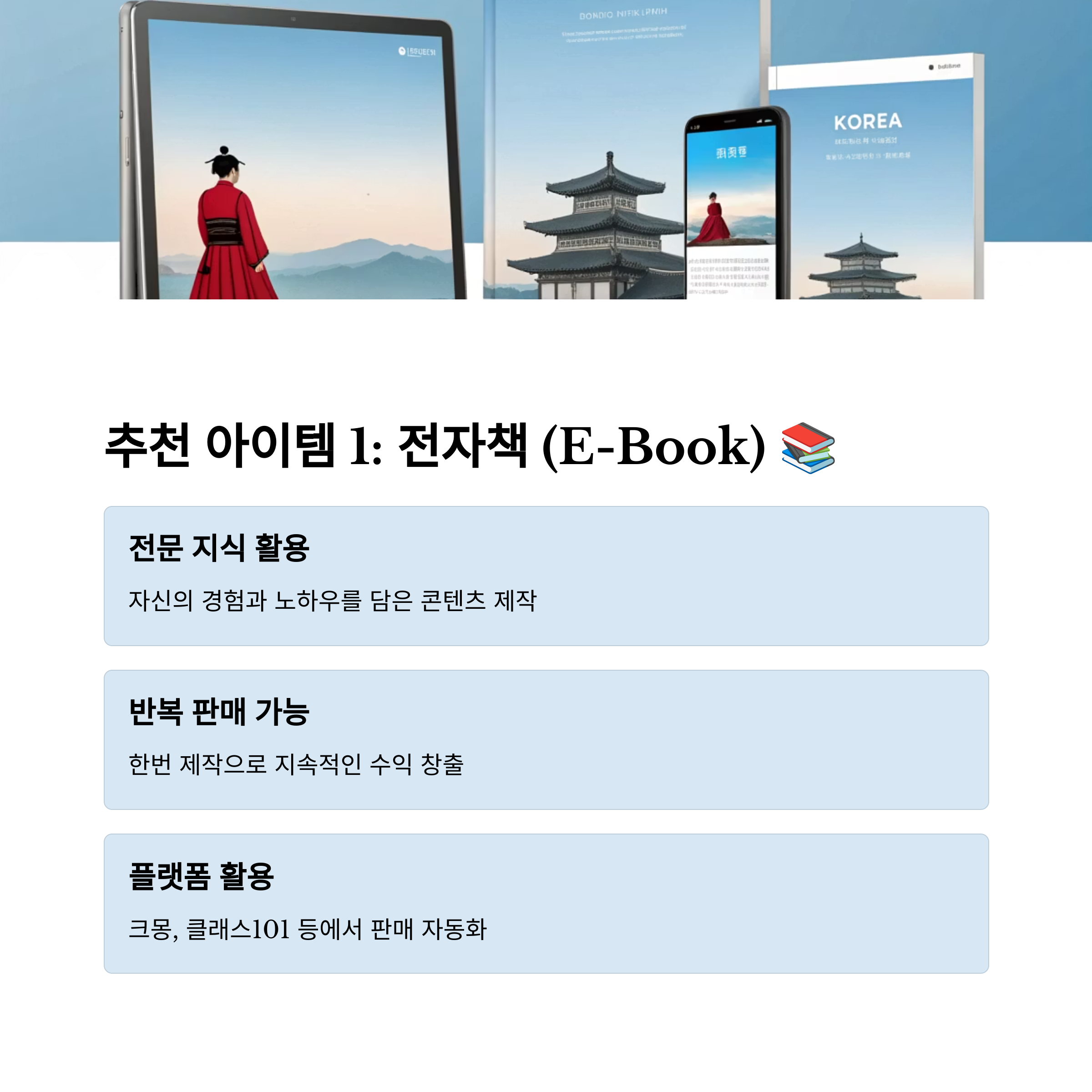| 스마트스토어, 크몽, 브런치, 클래스101 등에 판매 | 수익 구조 자동화 가능 | 후기 기반 입소문으로 점차 확장 가능 |