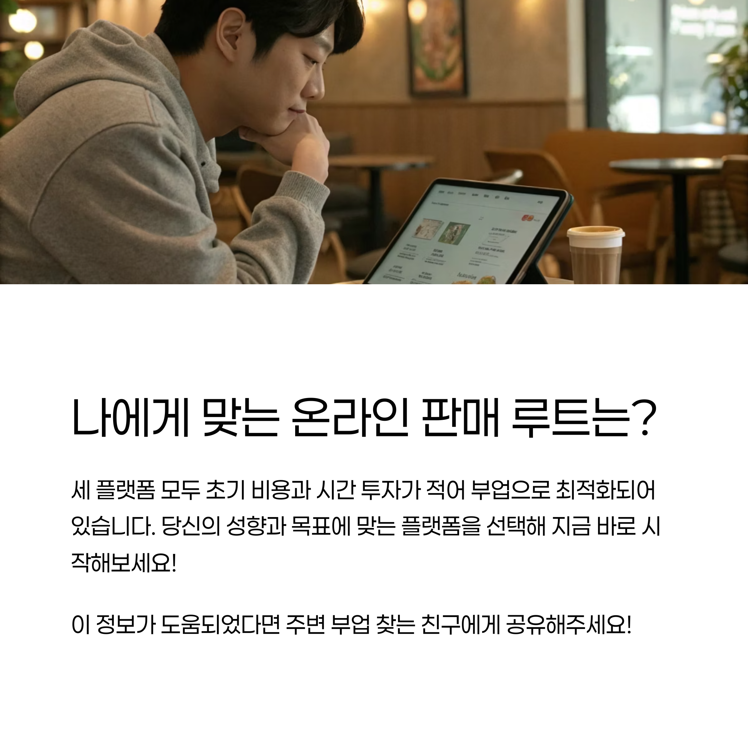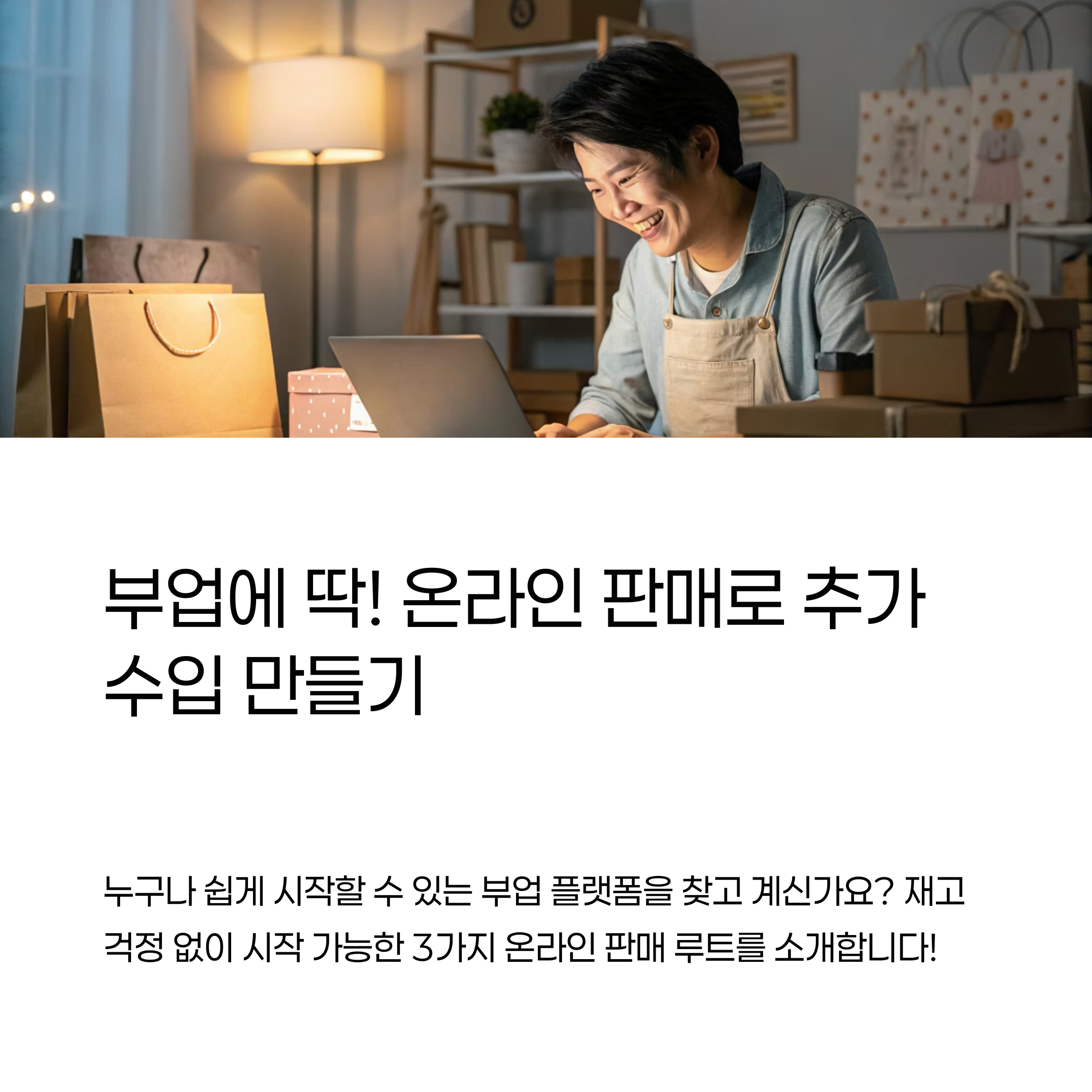 직장생활을 하면서도 추가 수익을 만들고 싶은 분들이 많습니다. 하지만 본업에 지장을 주지 않으면서도 실질적인 수익을 낼 수 있는 부업은 흔치 않죠. 오늘은 초보자도 도전 가능한, 그리고 시간과 자본 부담이 적은 '부업용 온라인 판매 루트' 3가지를 소개합니다. 가성비 좋은 온라인 루트를 찾고 계신다면 이 글을 끝까지 읽어보세요!