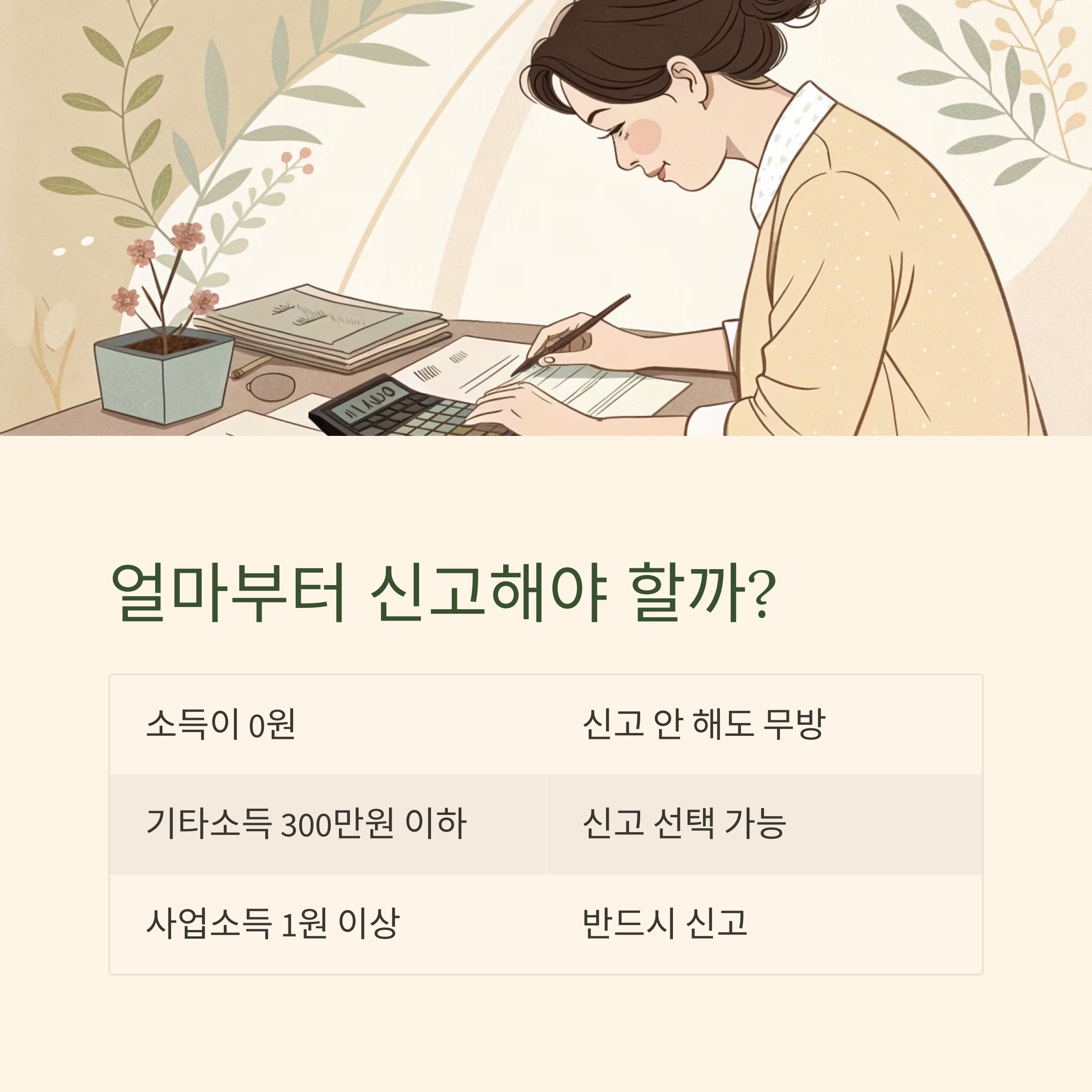 | 소득이 0원 | 신고 안 해도 무방 | 수익 발생 시점부터 신고 |