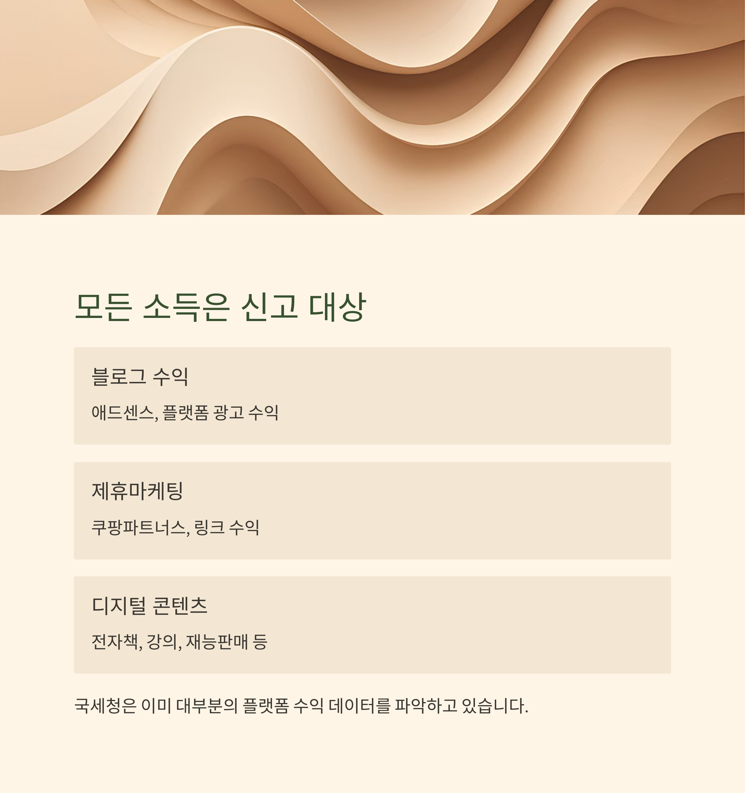 | 블로그 수익 | 애드센스, 플랫폼 광고 수익 | 신고 필요 |