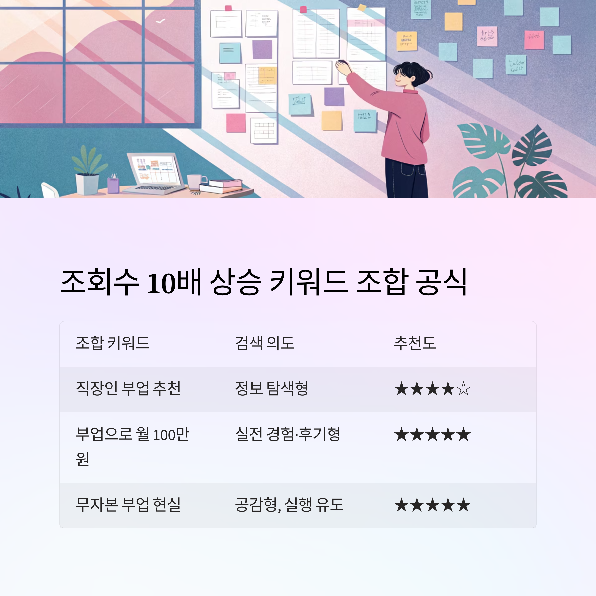 | 부업 | 부업으로 월 100만 원 | 실전 경험·후기형 | ★★★★★ |