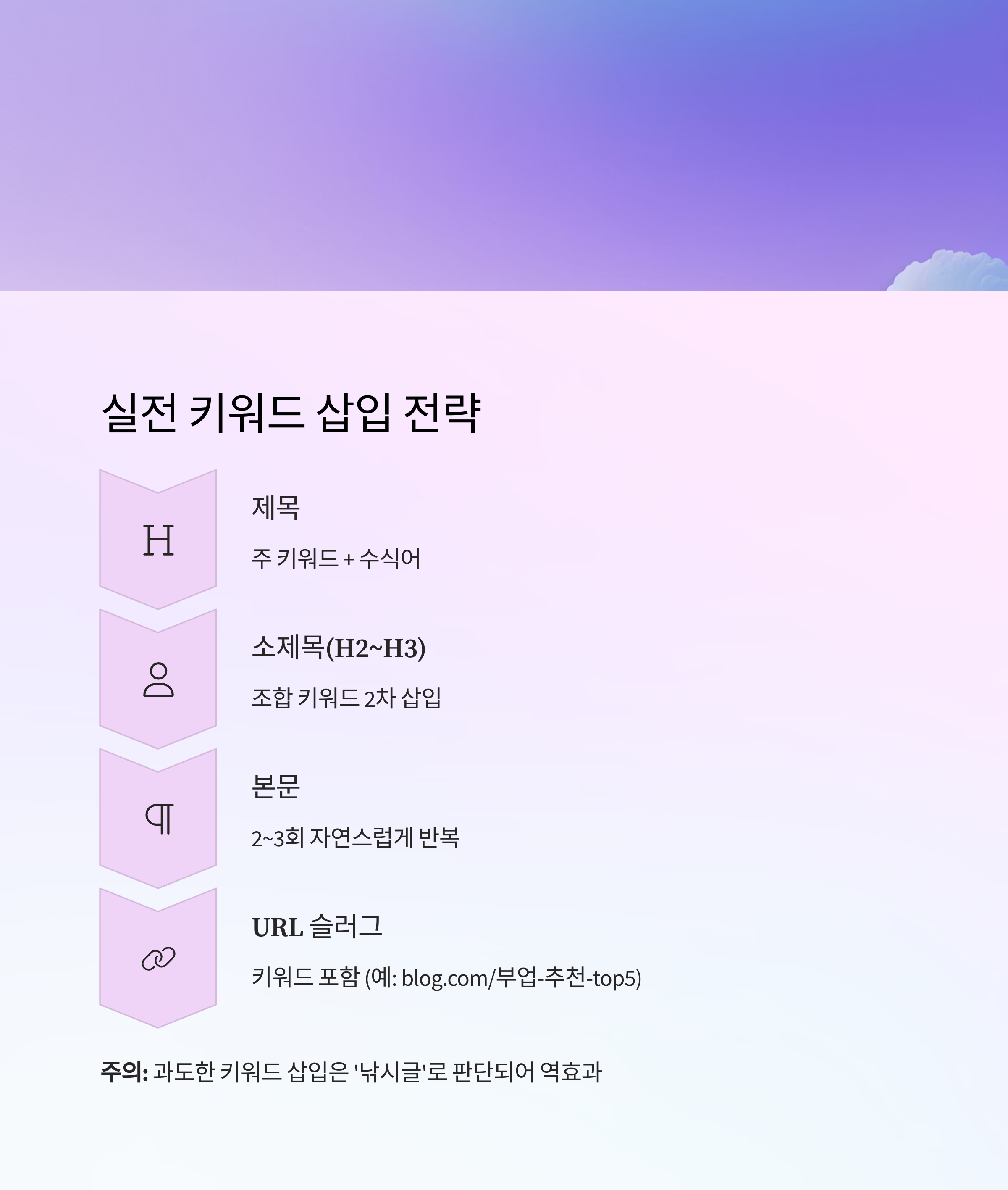 주의: 과도한 키워드 삽입은 ‘낚시글’로 판단되어 역효과 발생