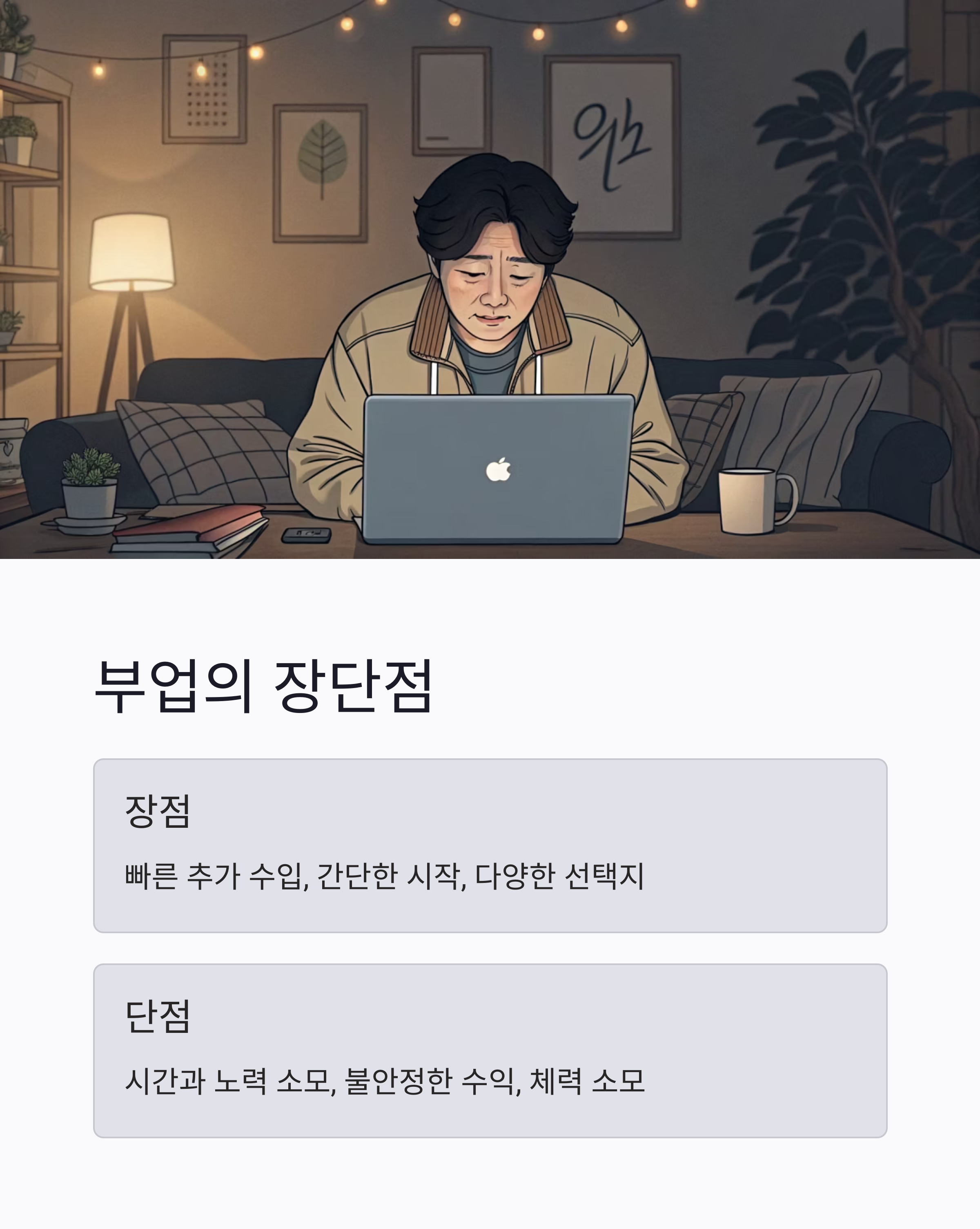 부업은 주로 본업 외에 추가적인 수입을 얻기 위한 방법으로, 누구나 쉽게 시작할 수 있는 장점이 있습니다. 예를 들어, 프리랜서, 온라인 판매, 블로그 운영 등이 대표적인 부업입니다. 부업은 빠르게 수입을 올릴 수 있지만, 시간이 부족하거나 전문성이 부족할 수 있는 단점도 존재합니다. 또한, 일정한 수익을 기대하기 어렵기 때문에 부업이 직업으로 성장하기까지는 상당한 시간과 노력이 필요할 수 있습니다.