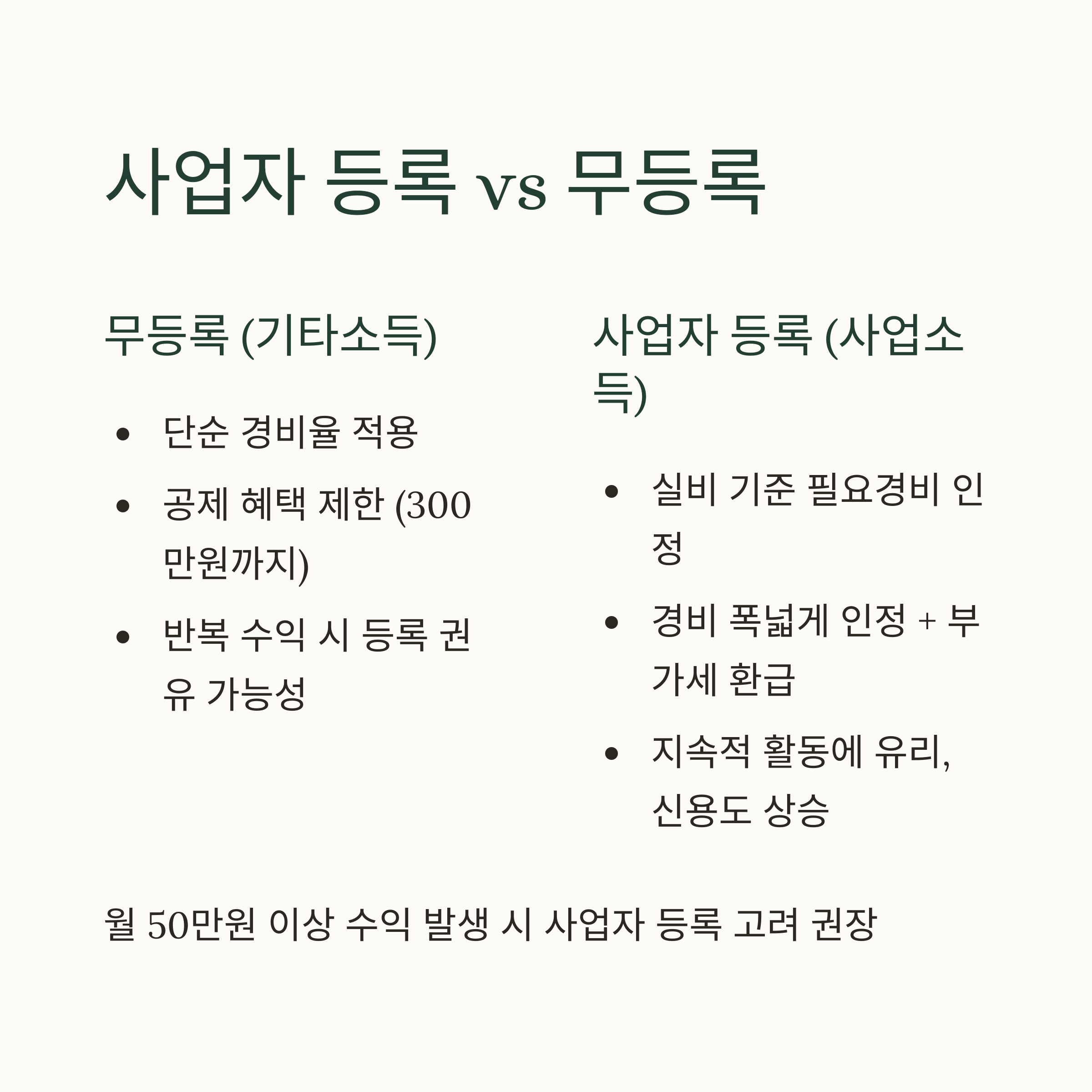 한 번이라도 월 50만 원 이상 수익 발생 시 사업자 등록을 고려하는 것이 유리합니다.