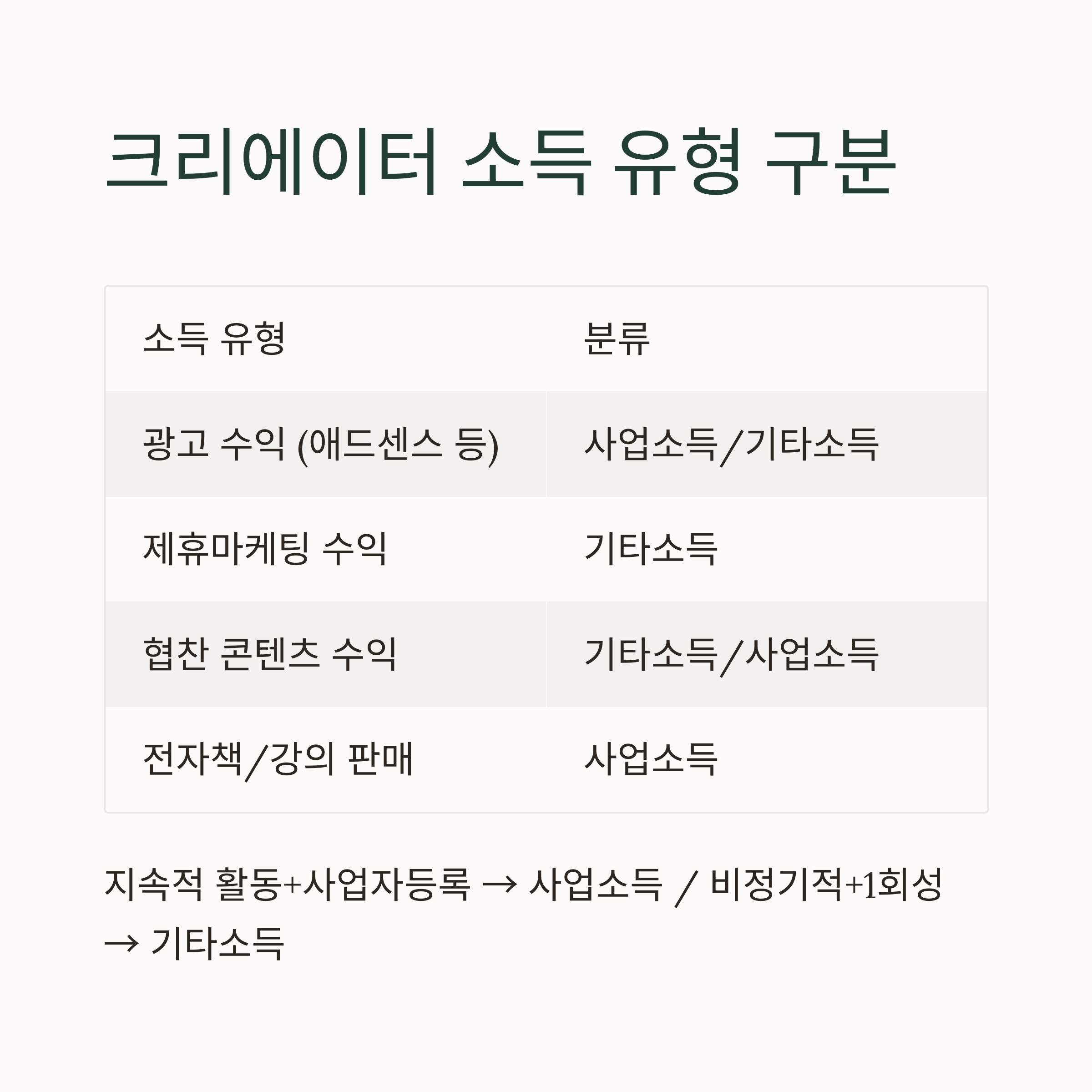 | 협찬 콘텐츠 수익 | 제품 협찬, 현금 광고, 포스팅 대가 등 | 기타소득 or 사업소득 |