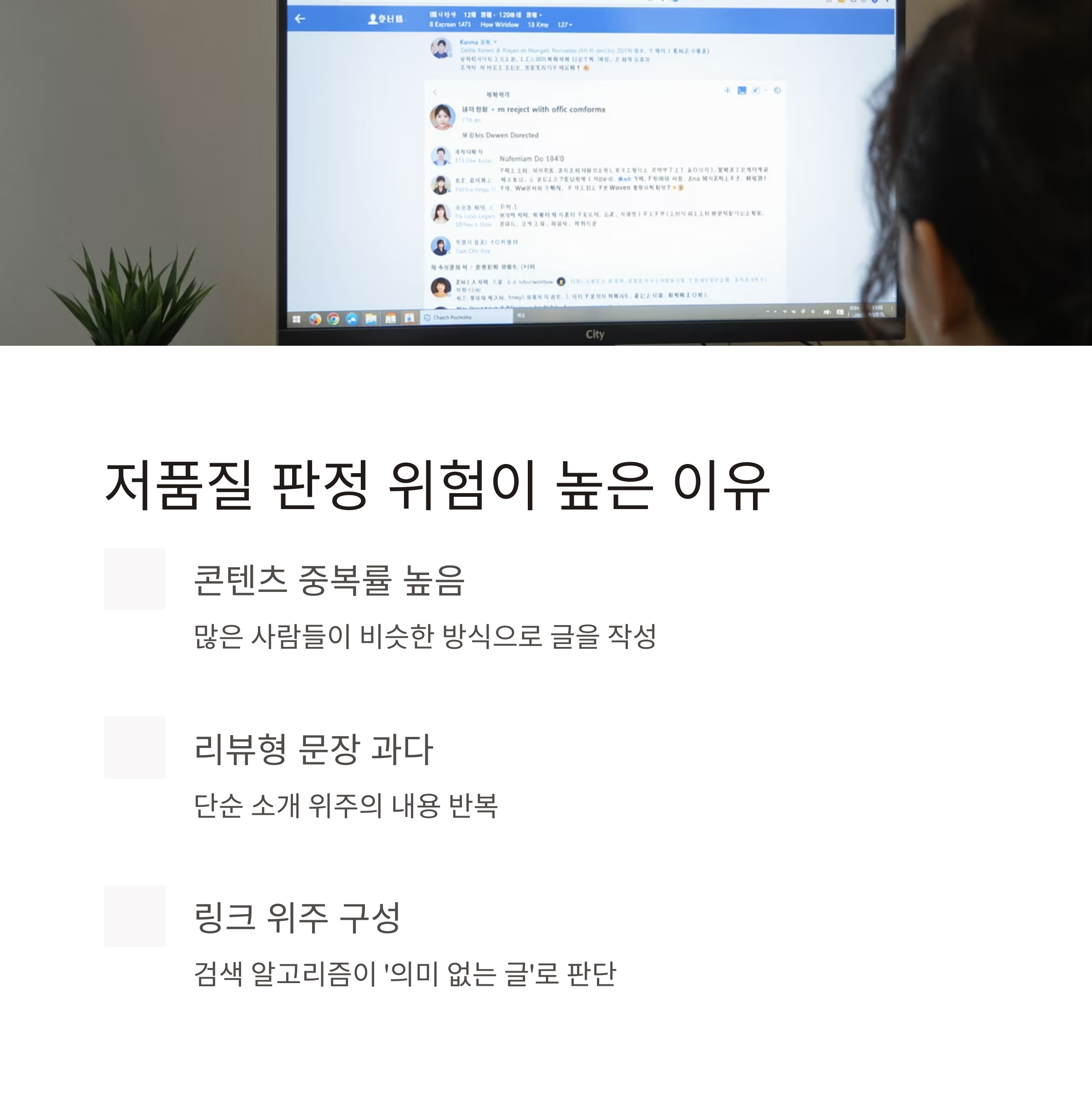 이로 인해 콘텐츠 중복률이 높고, 리뷰형, 소개형 문장이 과다하며, 링크 위주의 글이 되기 쉽습니다.