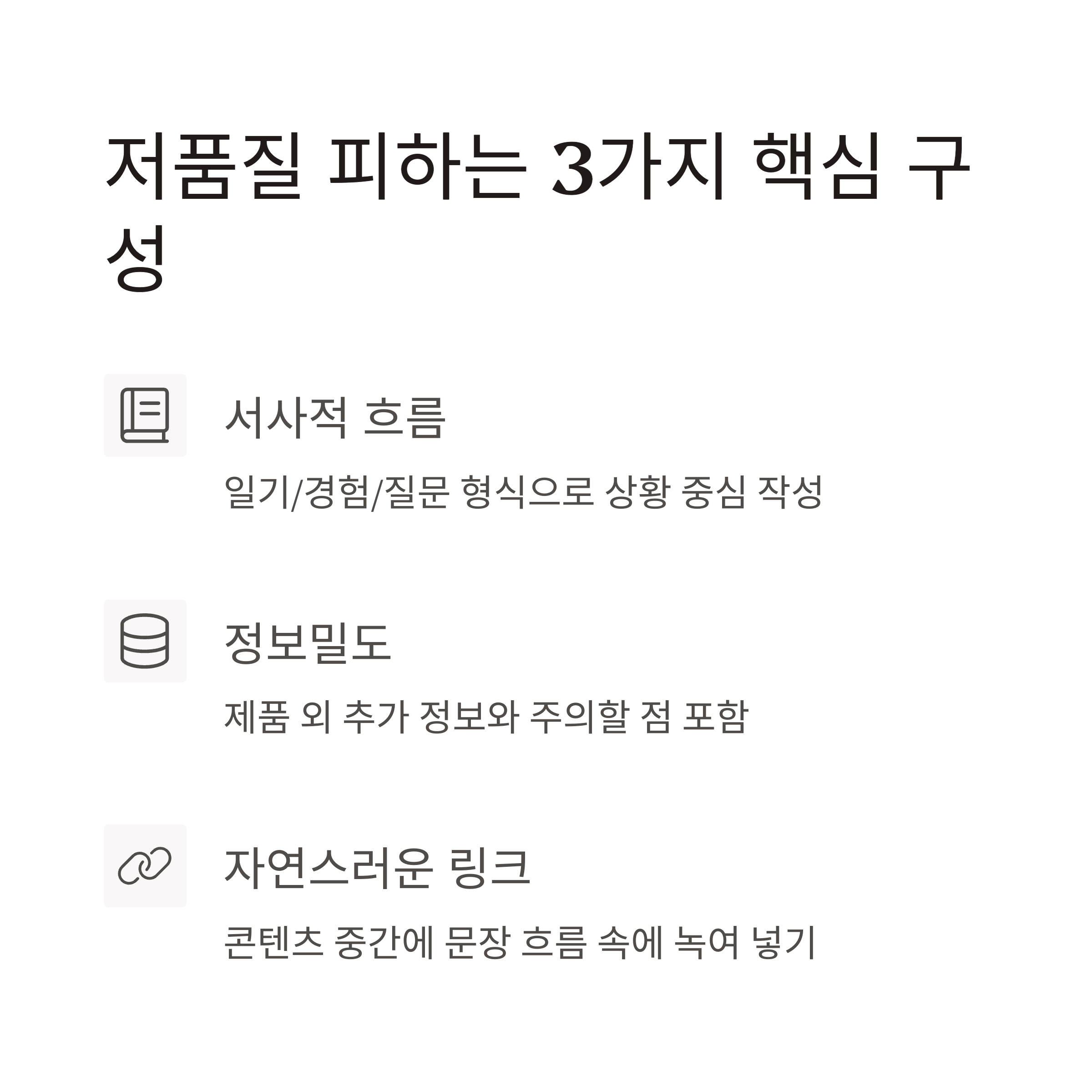 | 정보밀도 | 제품 외 정보 포함 | "같이 보면 좋은 것" "주의할 점" 삽입 |