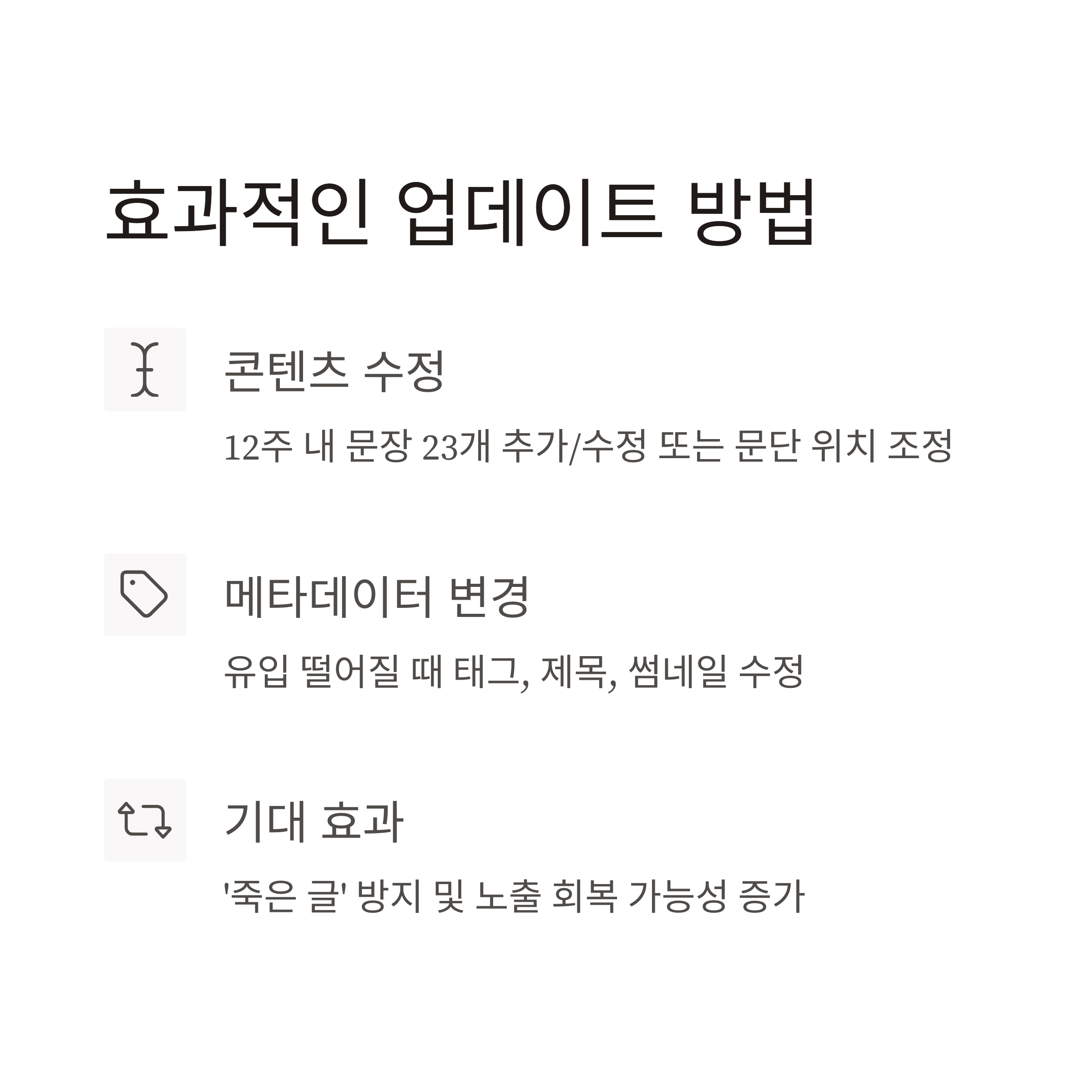 글 발행 후 12주 내에 문장 2~3개 추가/수정 또는 문단 위치 조정을 통해