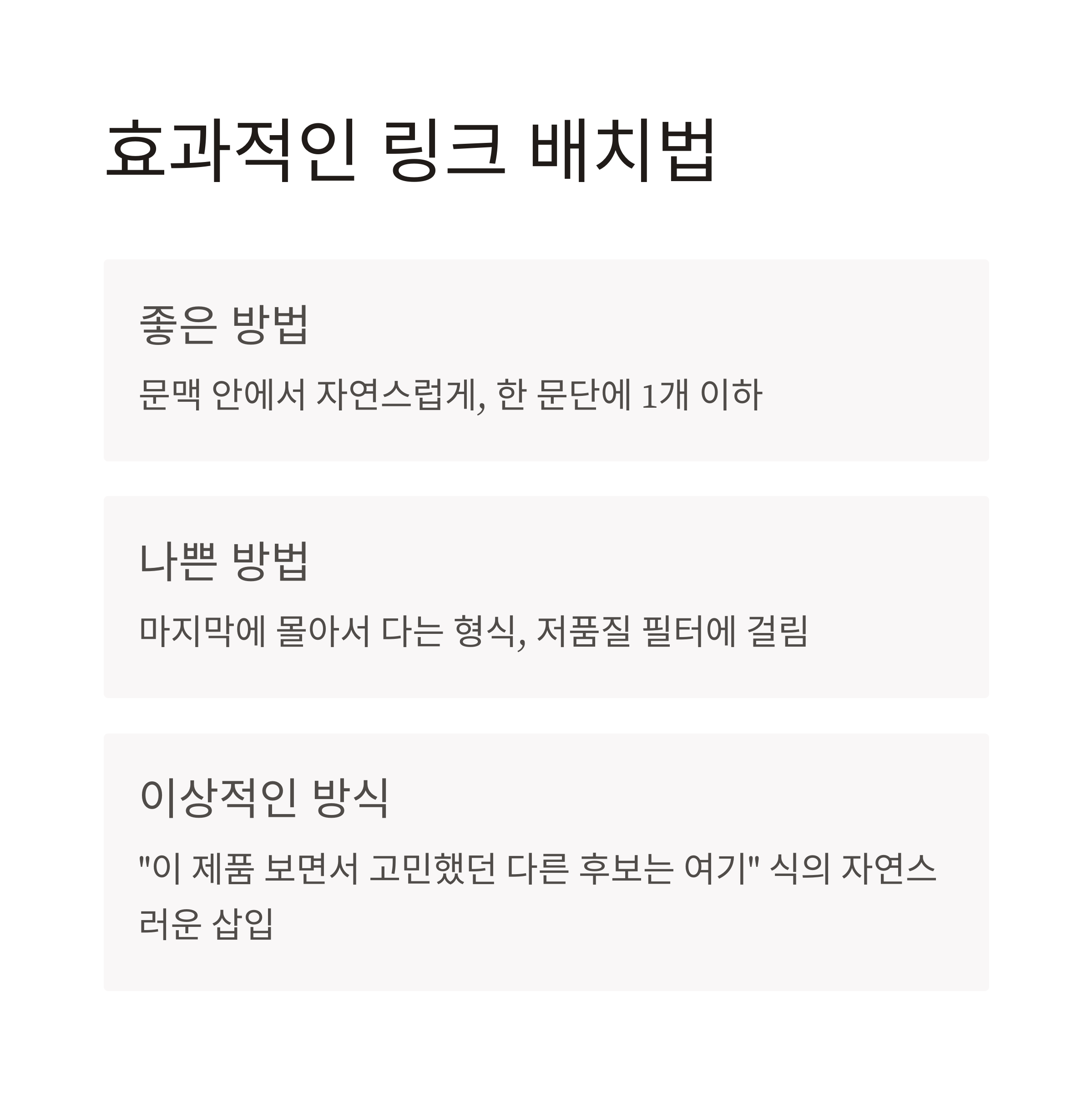 | 자연스러운 링크 | 콘텐츠 중간 삽입 | 문장 흐름 속에 녹여 넣기 |