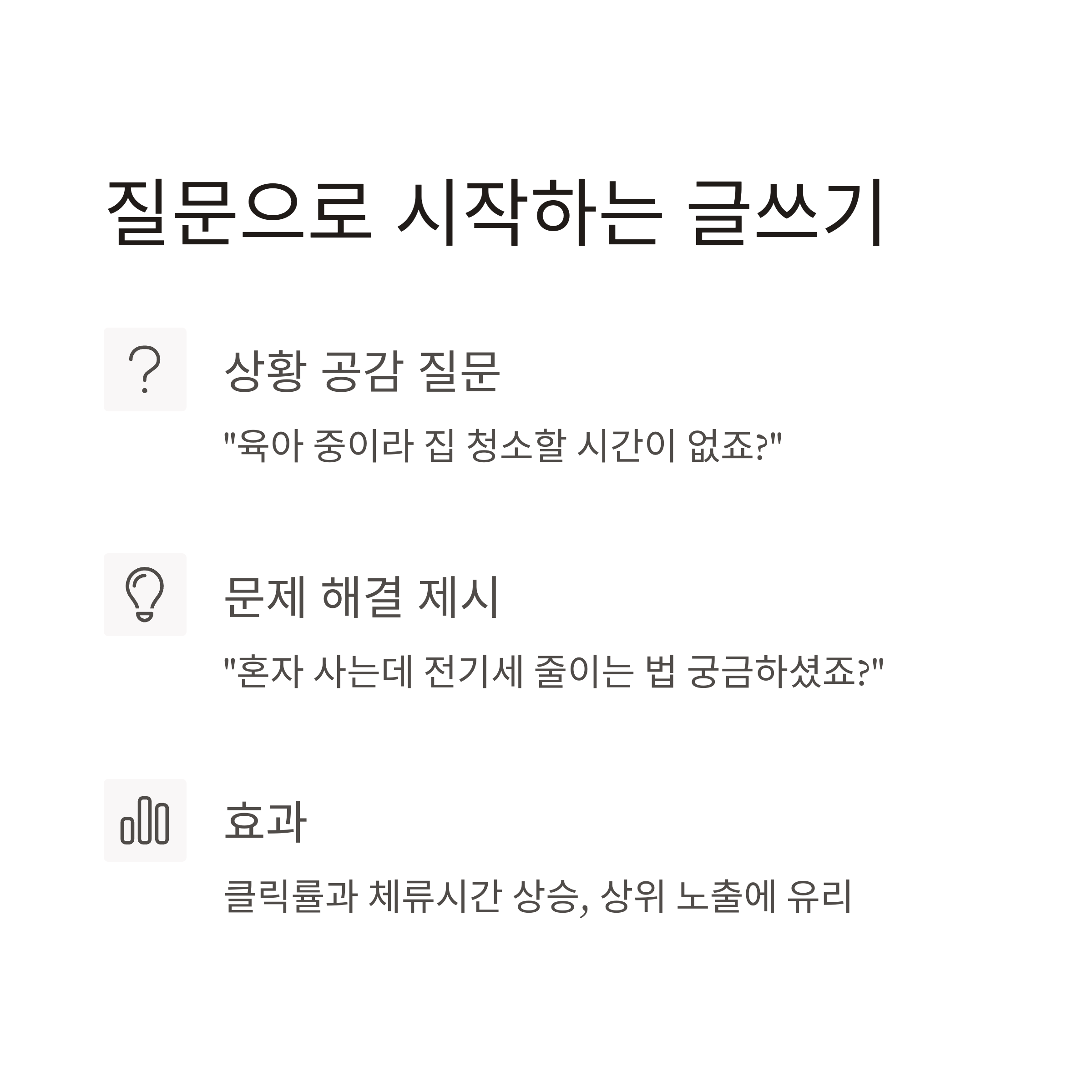 | 서사적 흐름 | 일기/경험/질문 형식 | 상품 중심 아닌 '상황 중심'으로 작성 |