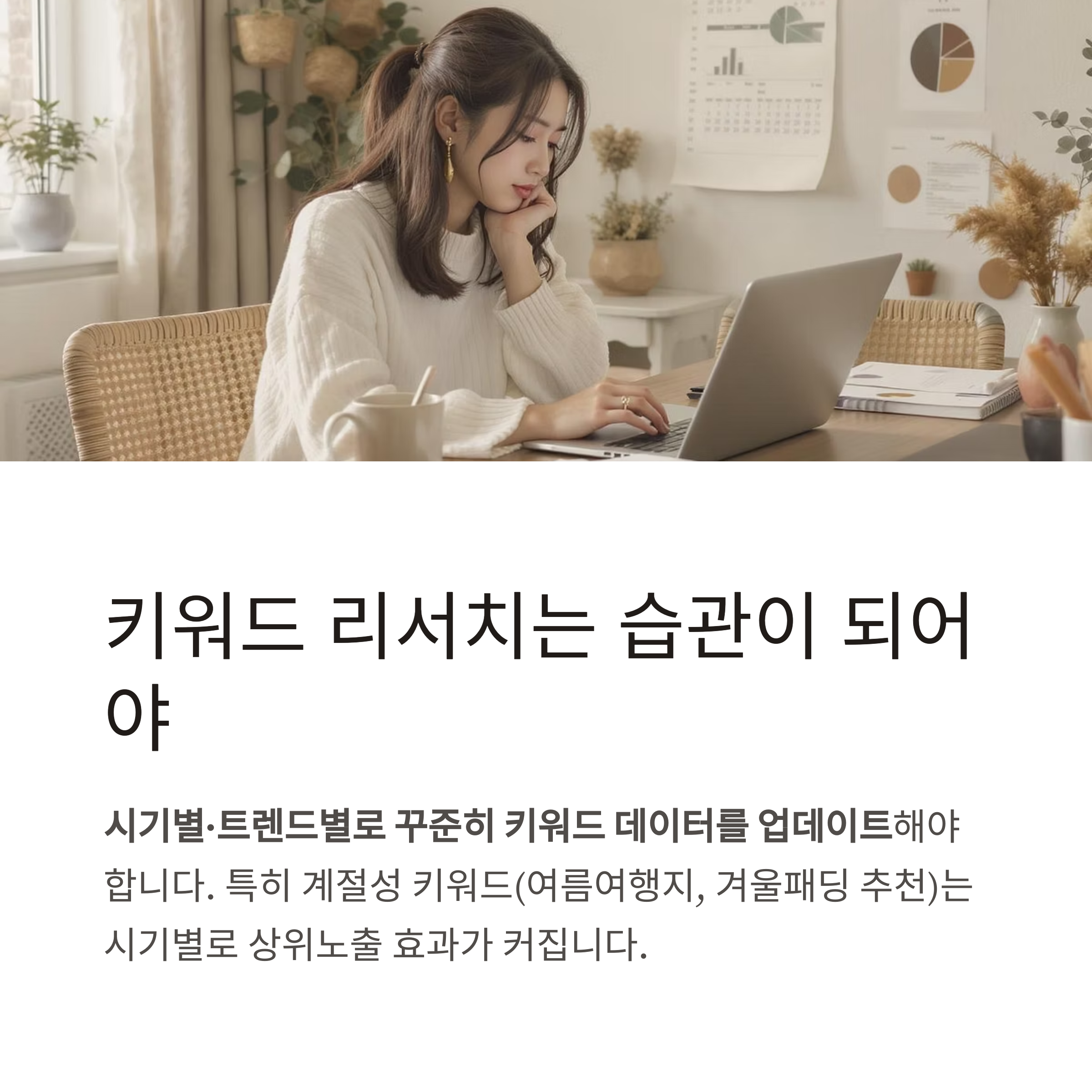 특히 계절성 키워드(여름여행지, 겨울패딩 추천)는 시기별로 상위노출 효과가 커집니다.