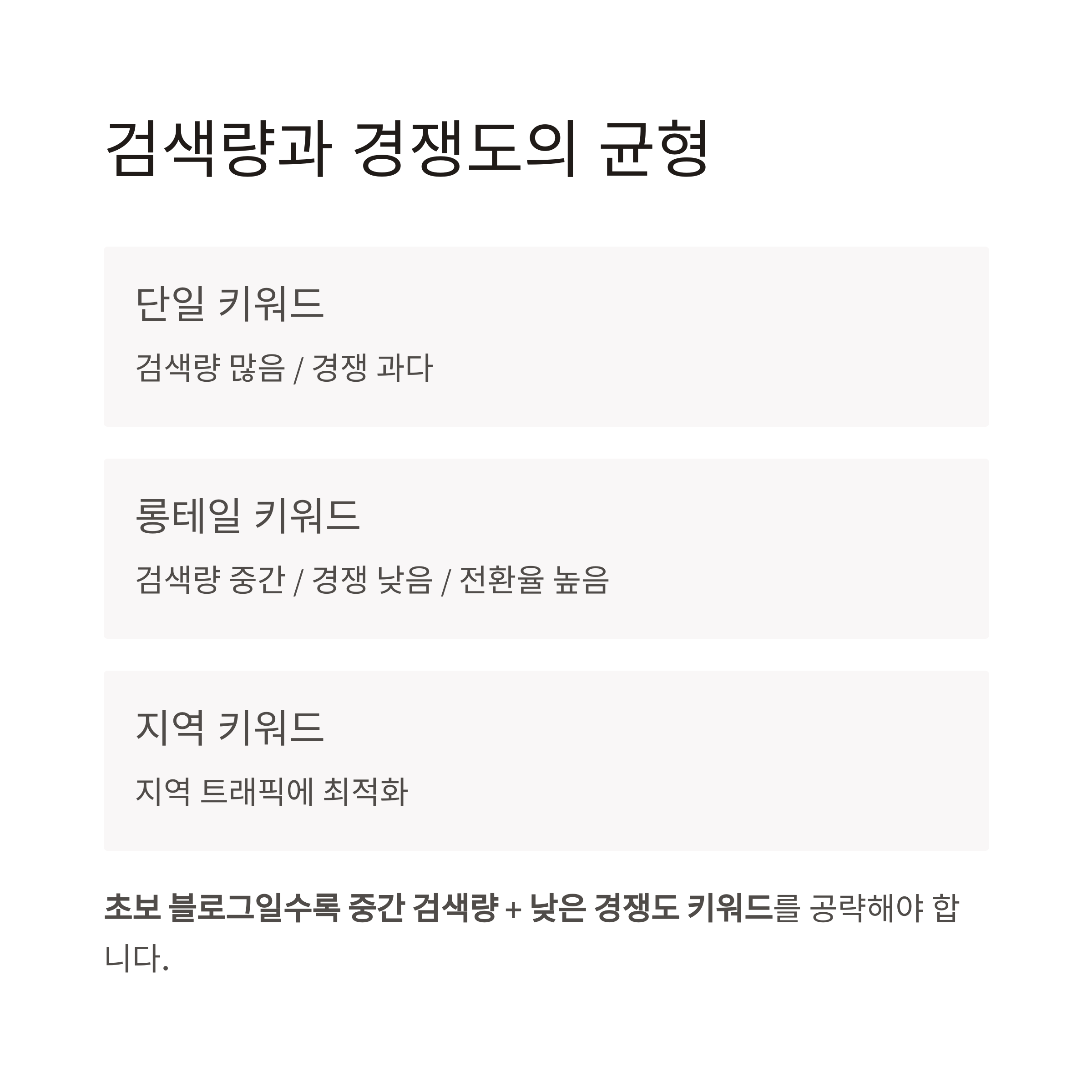 중요: 초보 블로그일수록 중간 검색량 + 낮은 경쟁도 키워드를 공략해야 합니다.