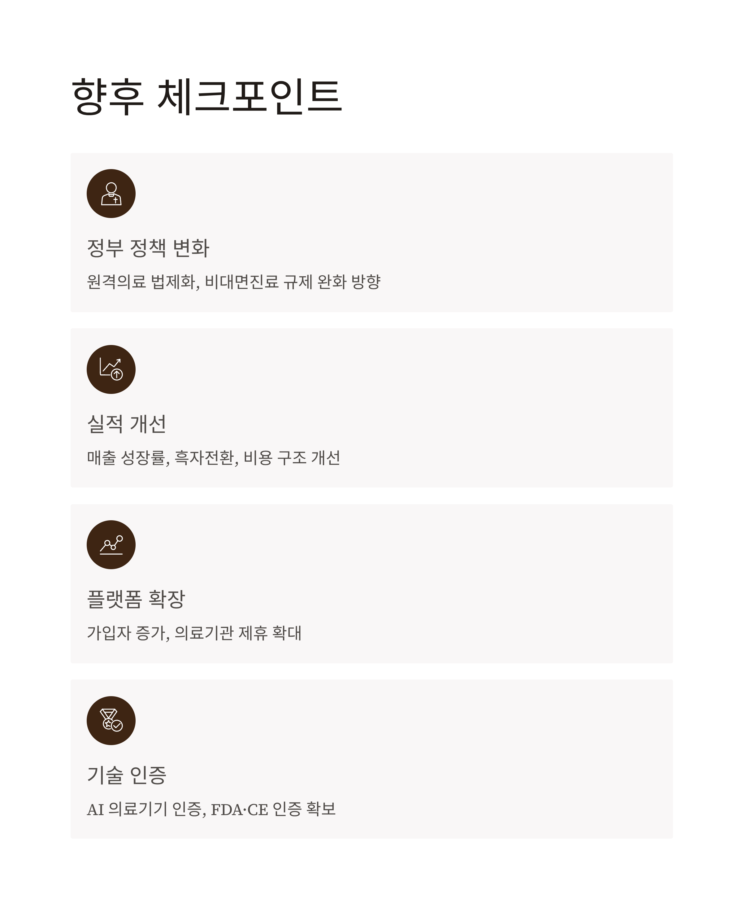 PER 산출이 어려울 만큼 아직 적자 상태이지만, 디지털헬스케어 테마 수혜주로서의 입지는 분명합니다. 정부가 제도적으로 비대면진료를 확대할 경우 직접적인 수혜가 가능한 구조죠. 다만, 매출 본격화와 수익화는 아직 과제로 남아 있습니다.