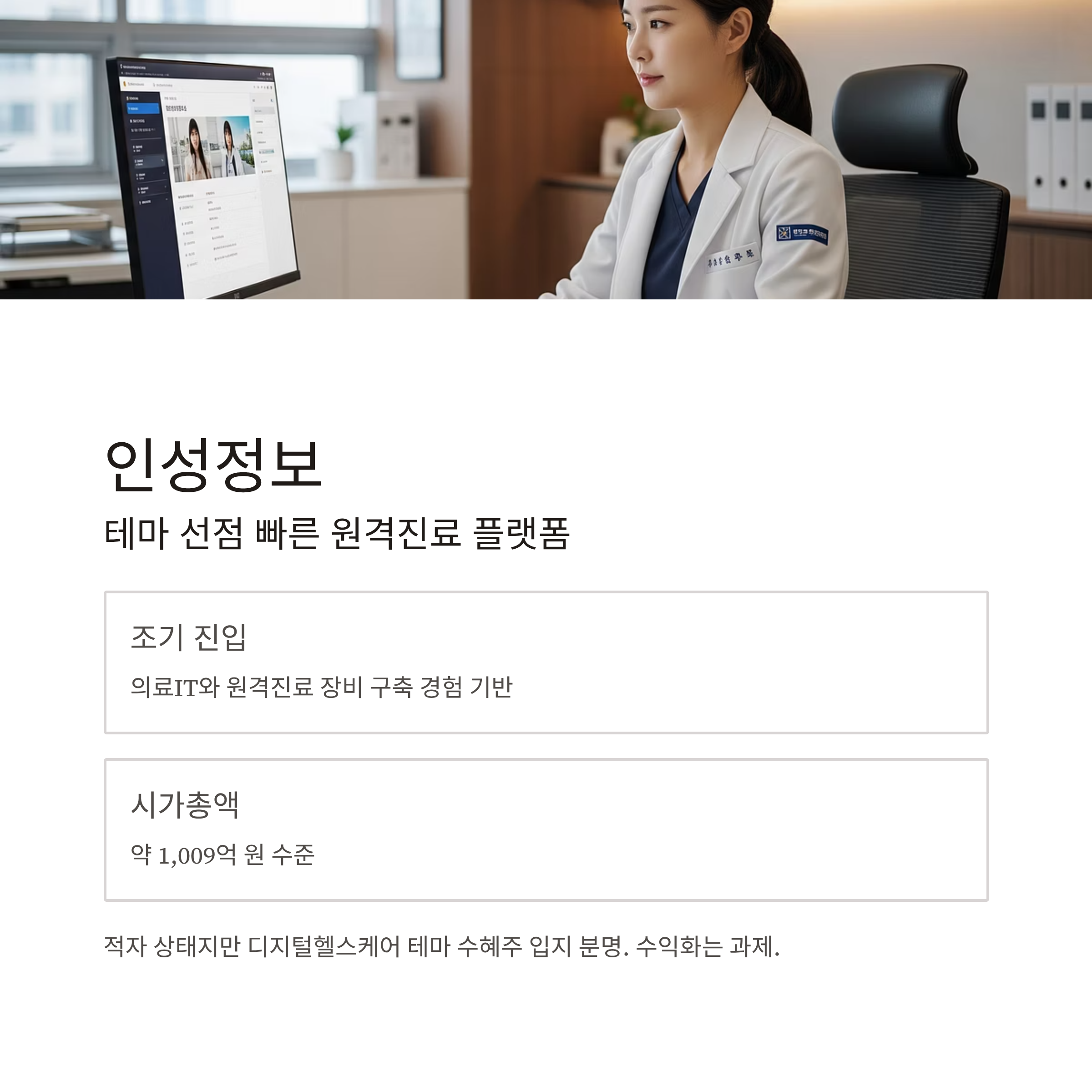 | 인성정보 | 적자 지속, 시총 1,009억 | PER 불가 / PBR 1.08배 | 비대면진료 플랫폼, 테마 민감도 높음 | 수익화 불확실, 경쟁사 다수 |