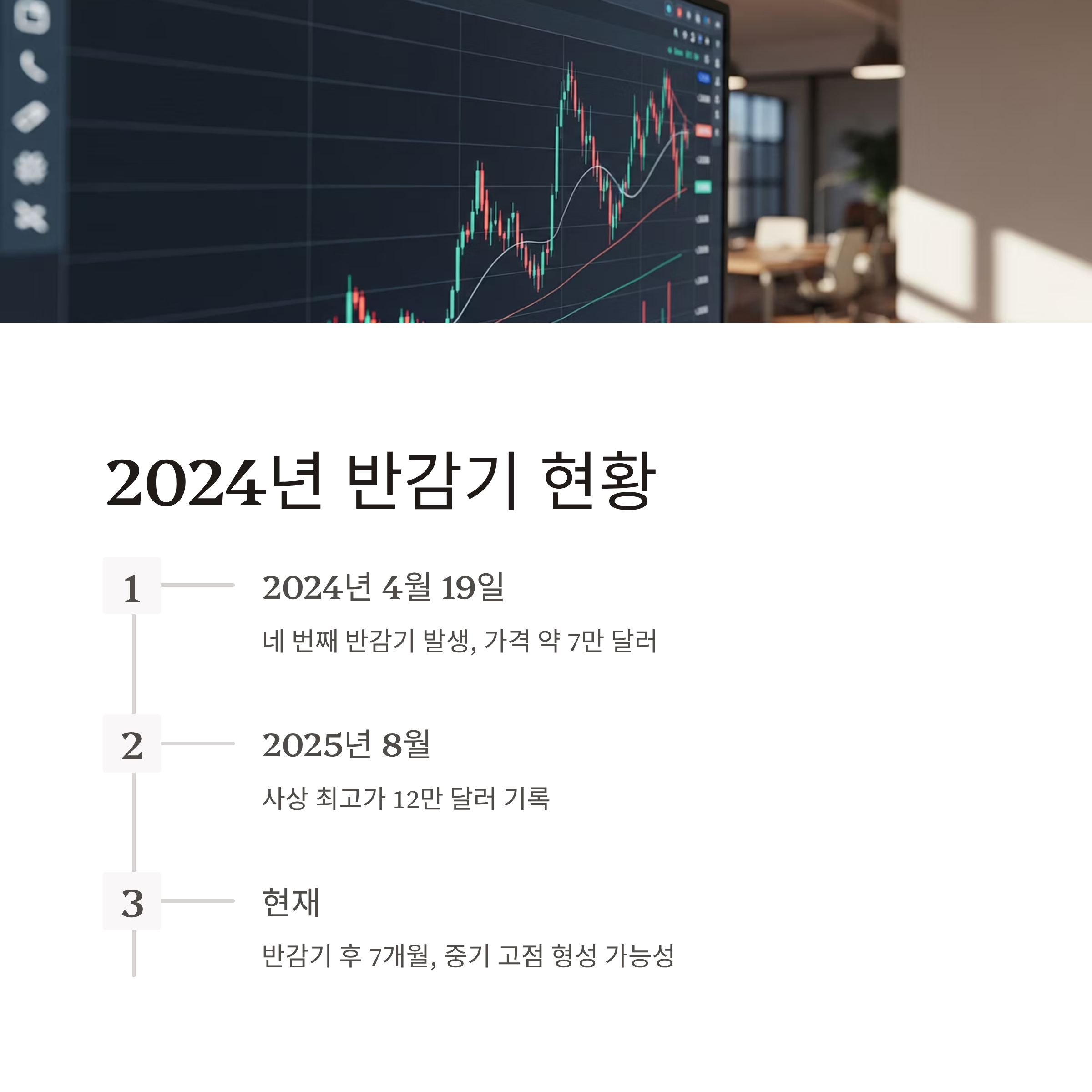 비트코인은 약 4년마다 ‘반감기’라는 중요한 전환점을 맞이합니다. 채굴 보상이 절반으로 줄어드는 이 이벤트는 공급 감소와 함께 투자자 심리에 큰 영향을 주는데요. 특히 반감기 이후 12개월은 그간의 역사적 흐름에서 눈에 띄는 가격 상승 또는 조정 패턴이 반복되어 왔습니다. 이번 글에서는 2024년 반감기 이후 진행된 시장 흐름을 토대로, 앞으로 1년간 비트코인의 가격이 어떻게 움직일 수 있을지 전망해보고, 폭등과 폭락 시나리오를 구체적으로 정리해 보았습니다.