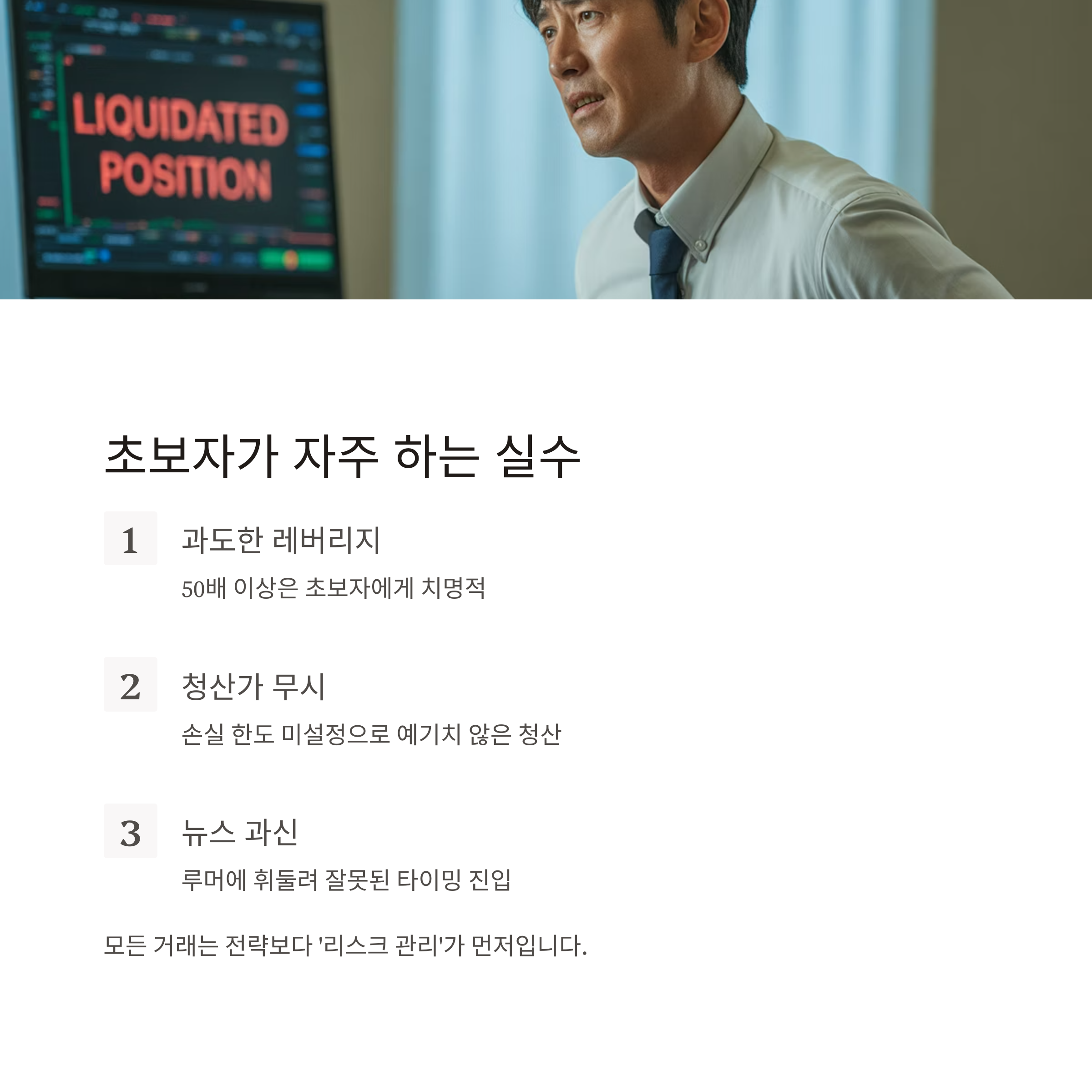 1. 과도한 레버리지 사용: 50배 이상은 초보자에게 치명적일 수 있음