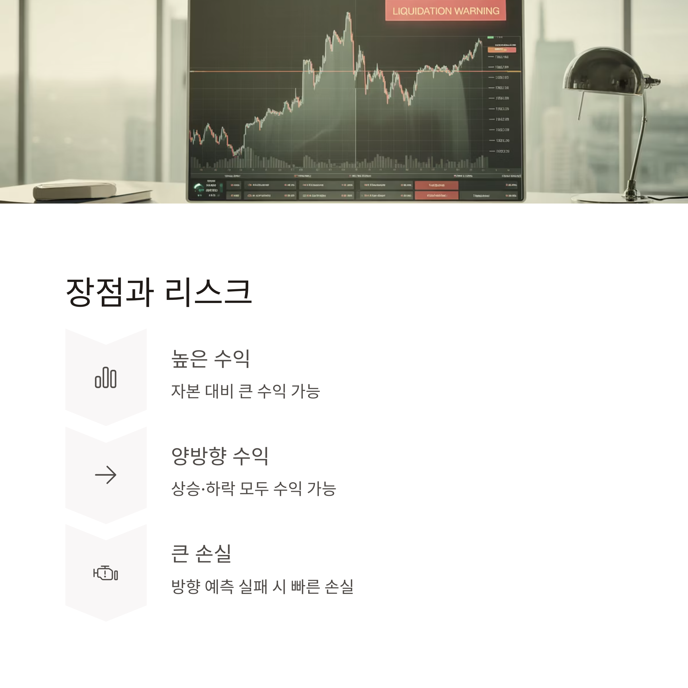 | 수익성 | 자본 대비 높은 수익 가능 | 반대로 손실도 빠르고 크게 발생 가능 |