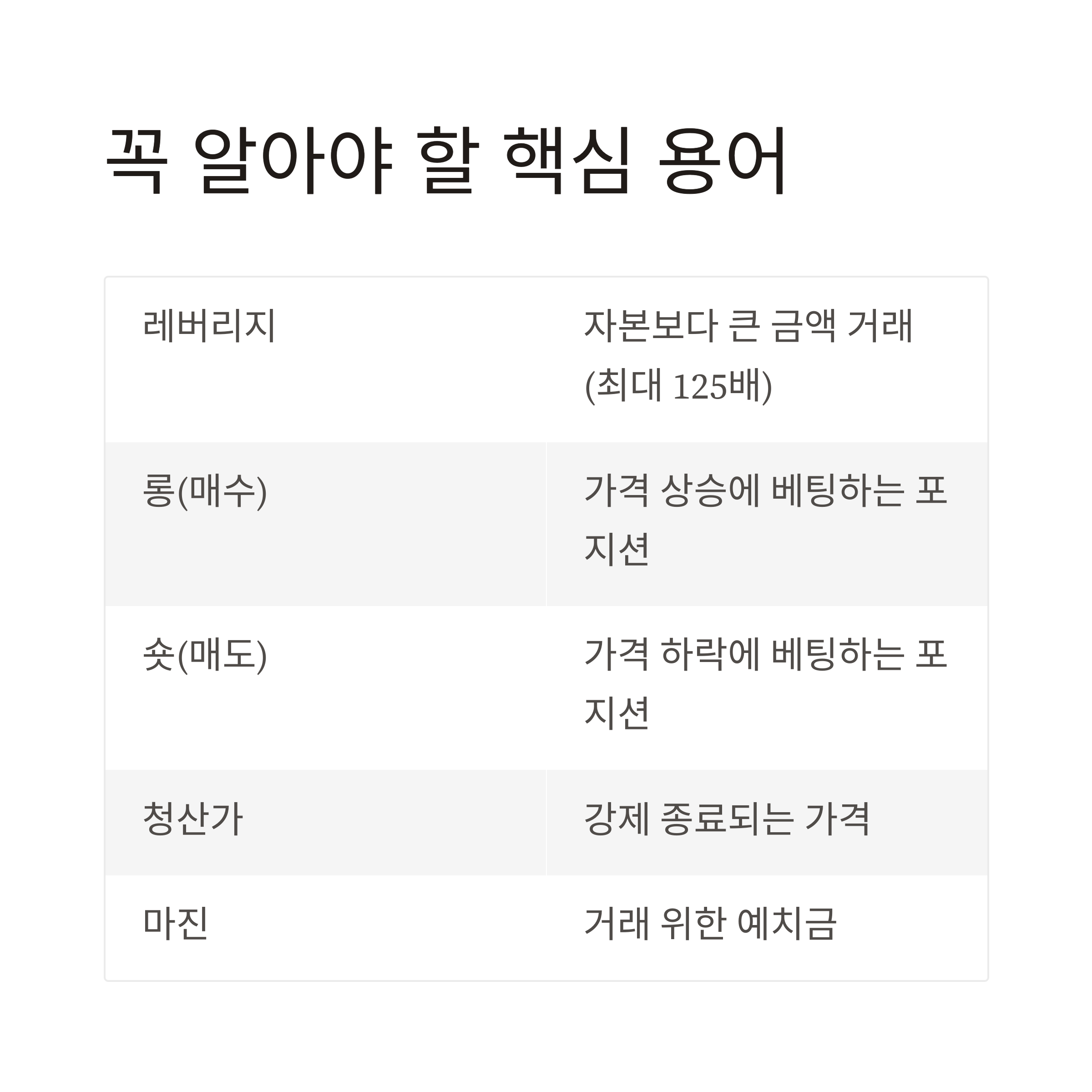 기초 개념 없이 시작하면 손실이 눈덩이처럼 불어날 수 있는 고위험 거래 방식입니다.