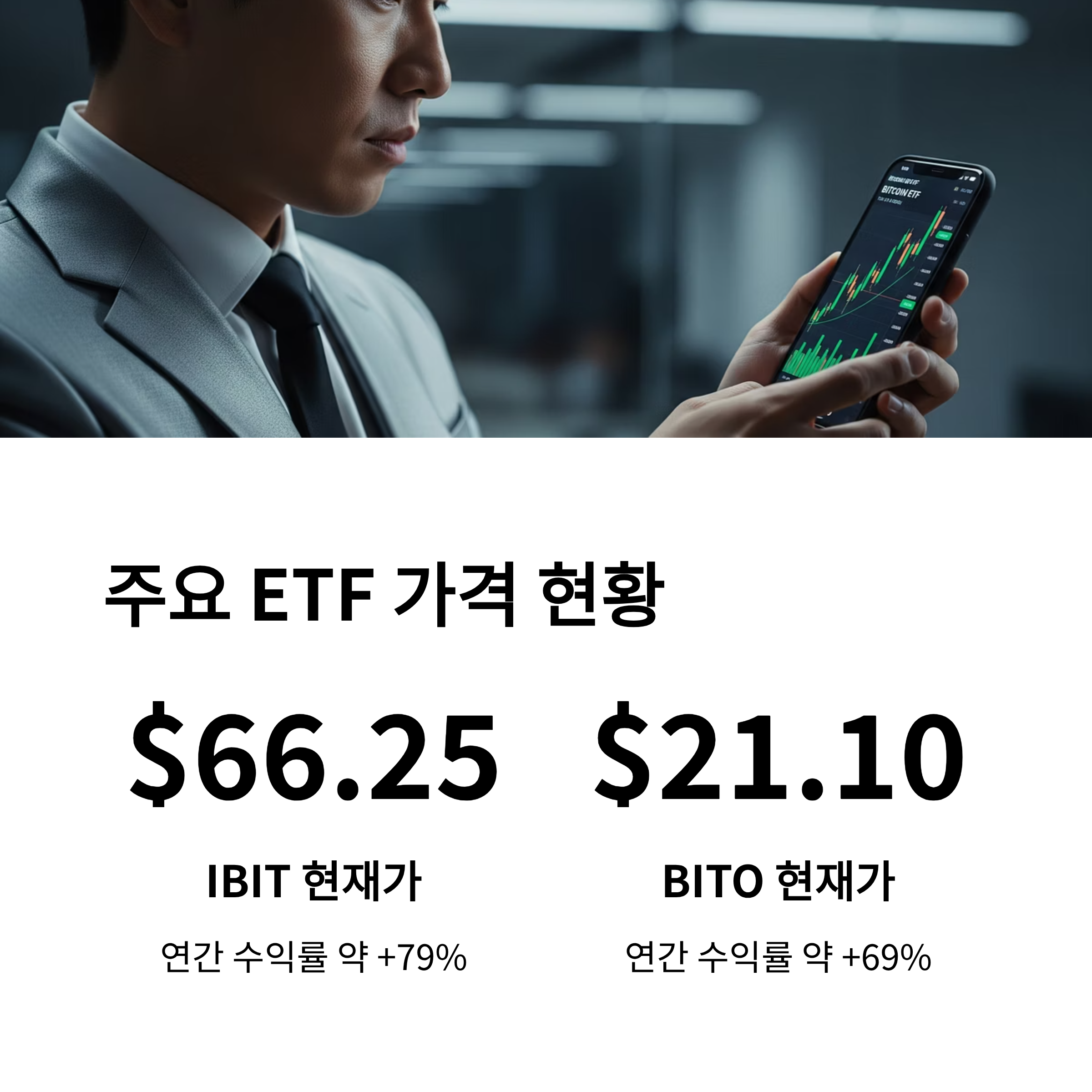 | 현재 시세 | BITO ≈ $21.10 / IBIT ≈ $66.25 |