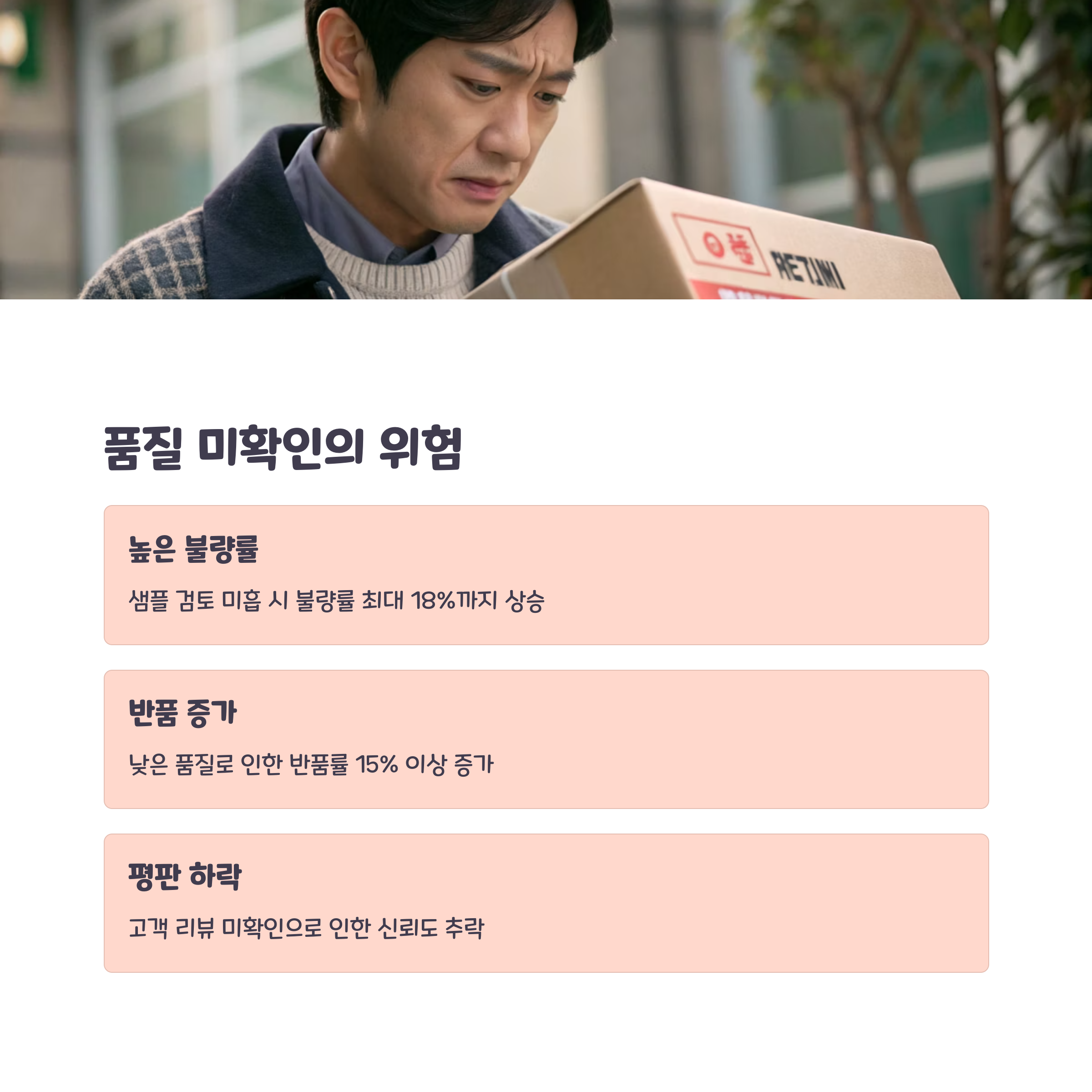 | 품질 미확인 상품 | 반품/불만족 증가 | 샘플 주문 후 테스트 진행 |