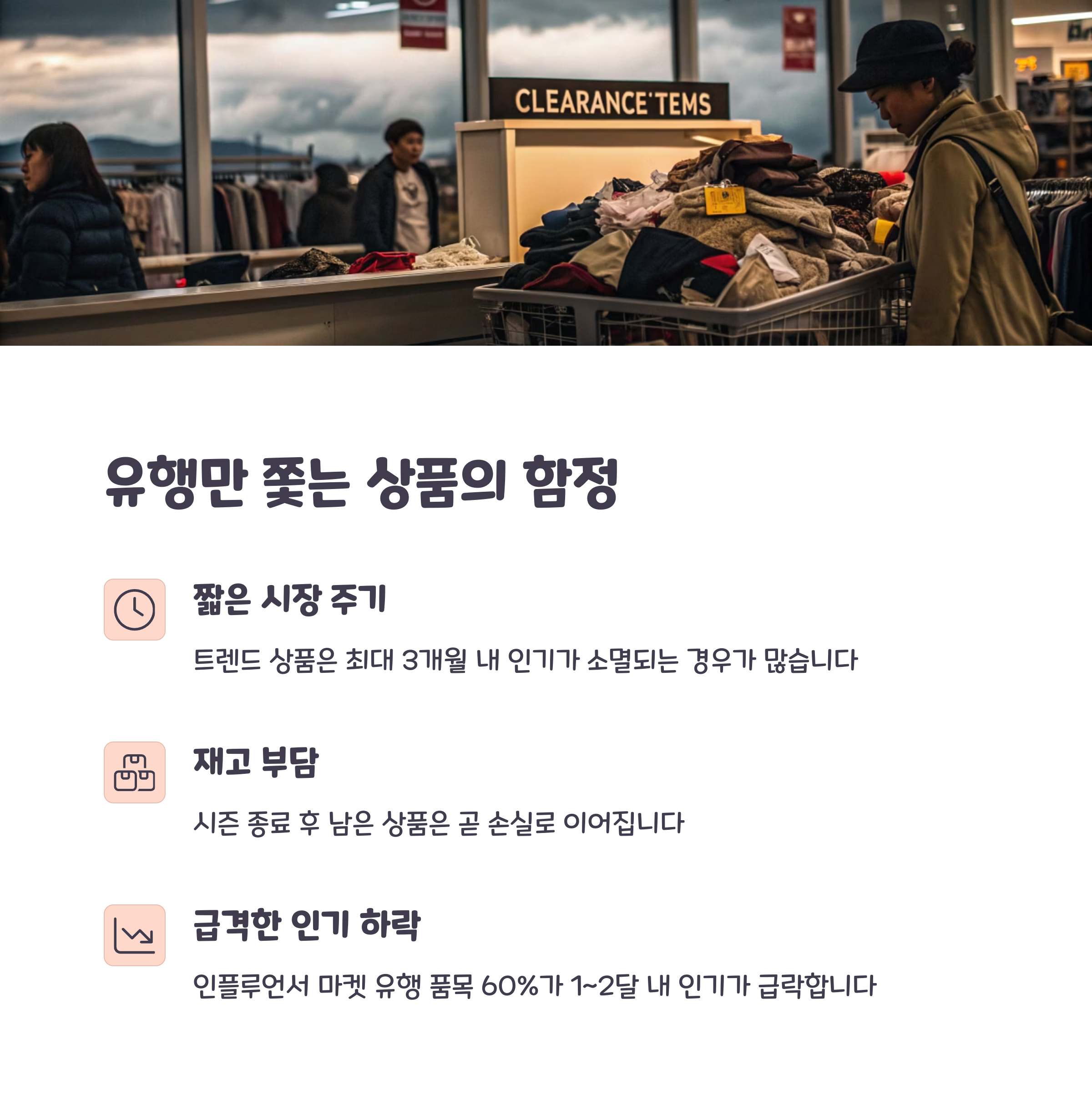 | 유행성 상품 | 수요 급감으로 재고 위험 | 시즌과 무관한 스테디셀러 |