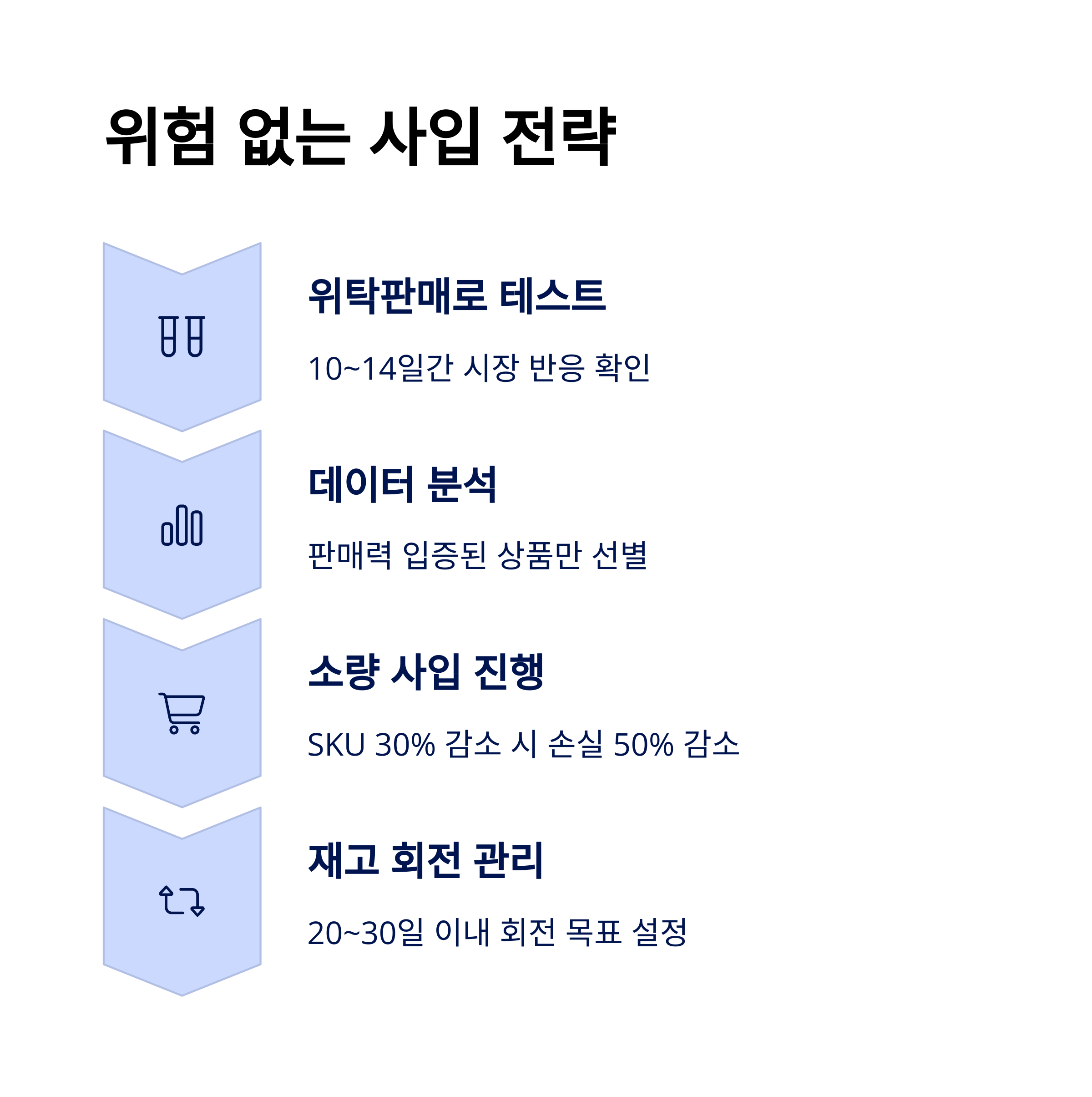 | 테스트 사입 전략 | 재고 순환 루틴 | 손해 최소화 방법 |