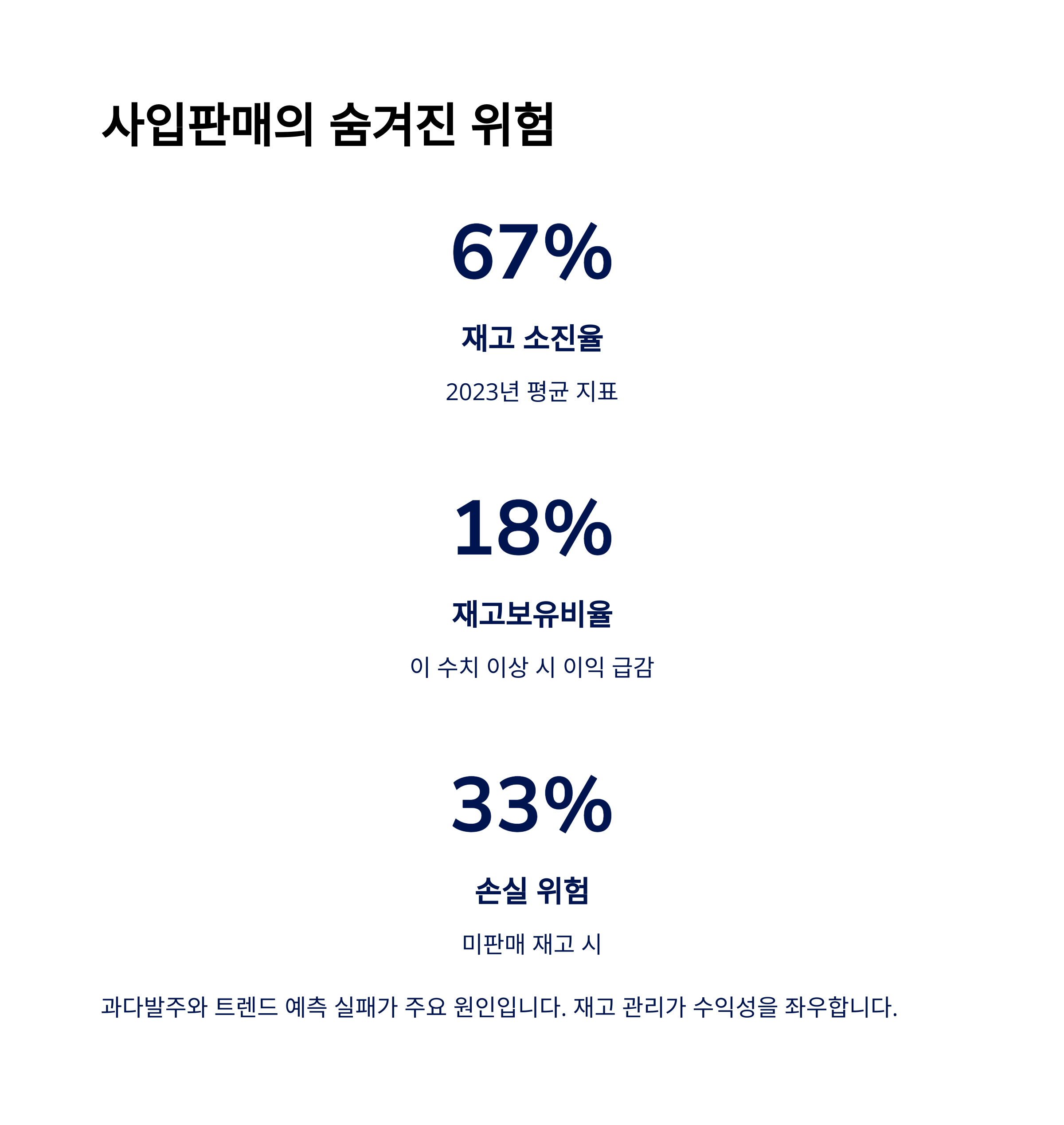 사입판매는 제대로 준비하면 마진이 높고 속도감 있는 비즈니스가 될 수 있습니다. 하지만 감으로 운영하면 재고 손실이 크게 발생할 수 있습니다. 위탁으로 먼저 테스트 → 데이터 기반 소량 사입 → 안전재고 설정 및 주간 체크 루틴. 이 3단계 구조를 갖추면 사입판매도 안정적 수익모델로 발전시킬 수 있습니다.