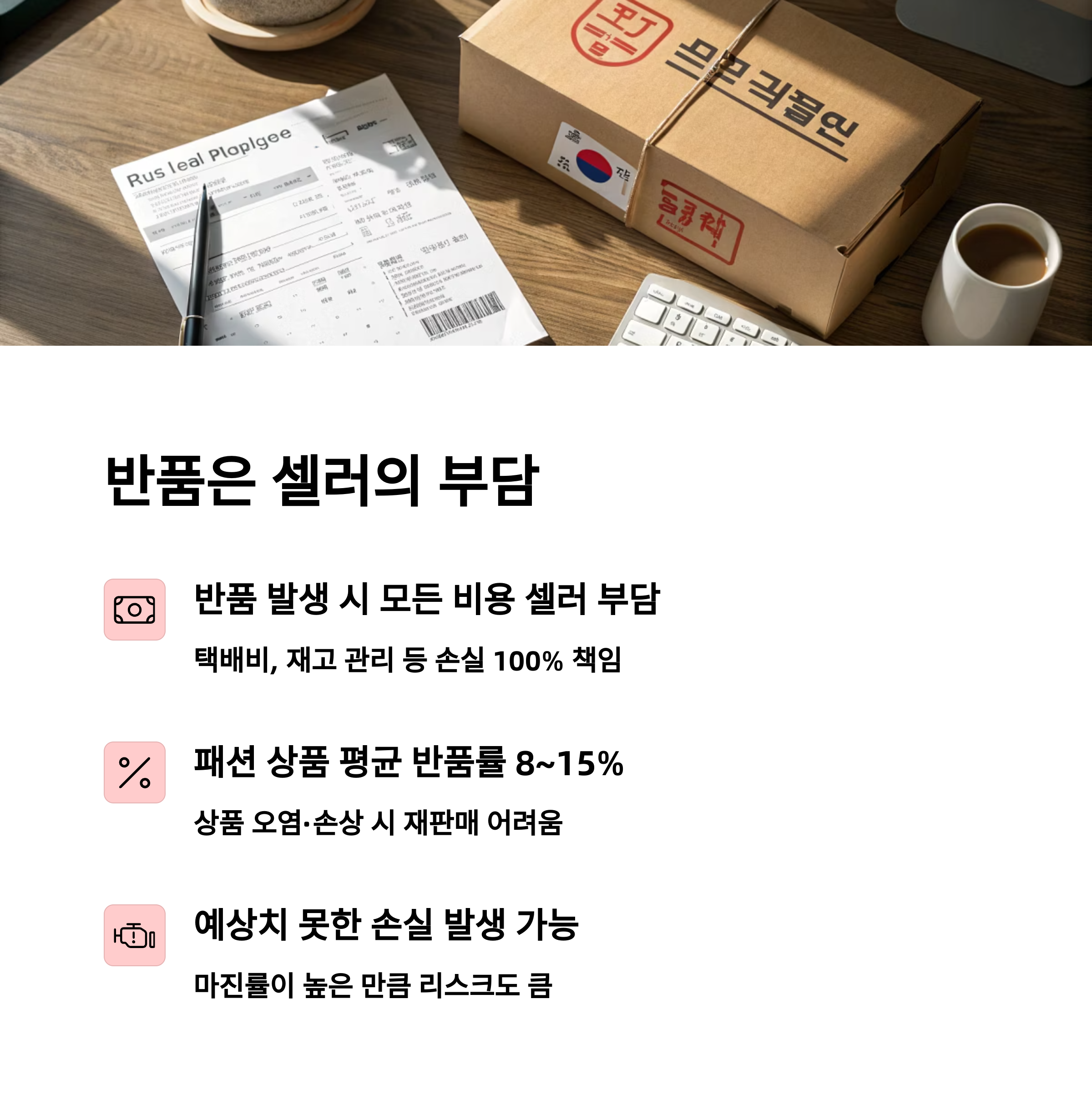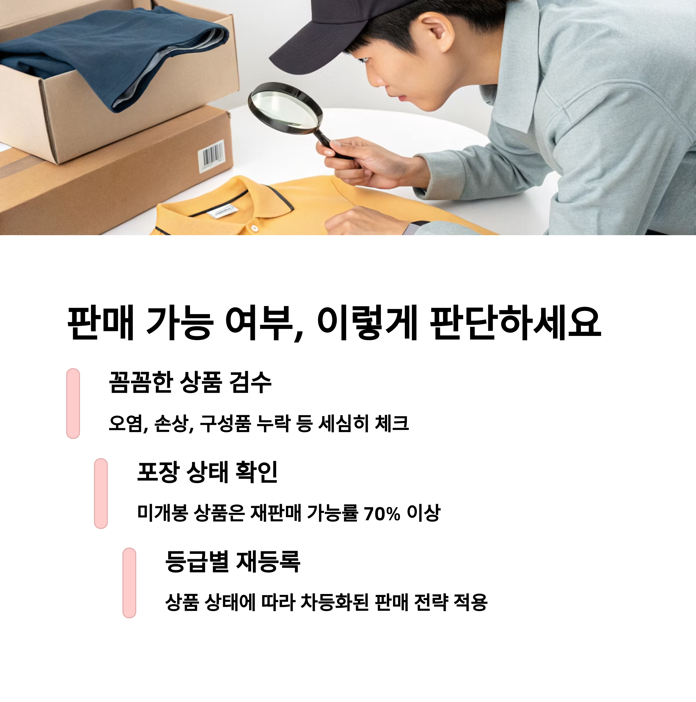 사입판매는 제품을 미리 확보해 판매하는 만큼, 반품 발생 시 전적으로 셀러가 책임을 져야 하는 구조입니다. 제품이 고객에게 도착한 이후, 단순변심이든 상품 하자든 반품 사유가 발생하면 물류비와 상품 회수까지 모두 부담해야 하죠. 문제는 이렇게 회수된 상품이 다시 판매 가능한 상태인지, 아니면 폐기해야 하는지 판단하는 기준</strong이 애매할 때가 많다는 점입니다. 저도 처음엔 단순히 ‘고객이 반품하면 다시 팔면 되지’라고 생각했지만, 실제로는 포장 훼손, 사용 흔적, 변색 등으로 재판매가 불가능한 경우가 꽤 있었습니다.
