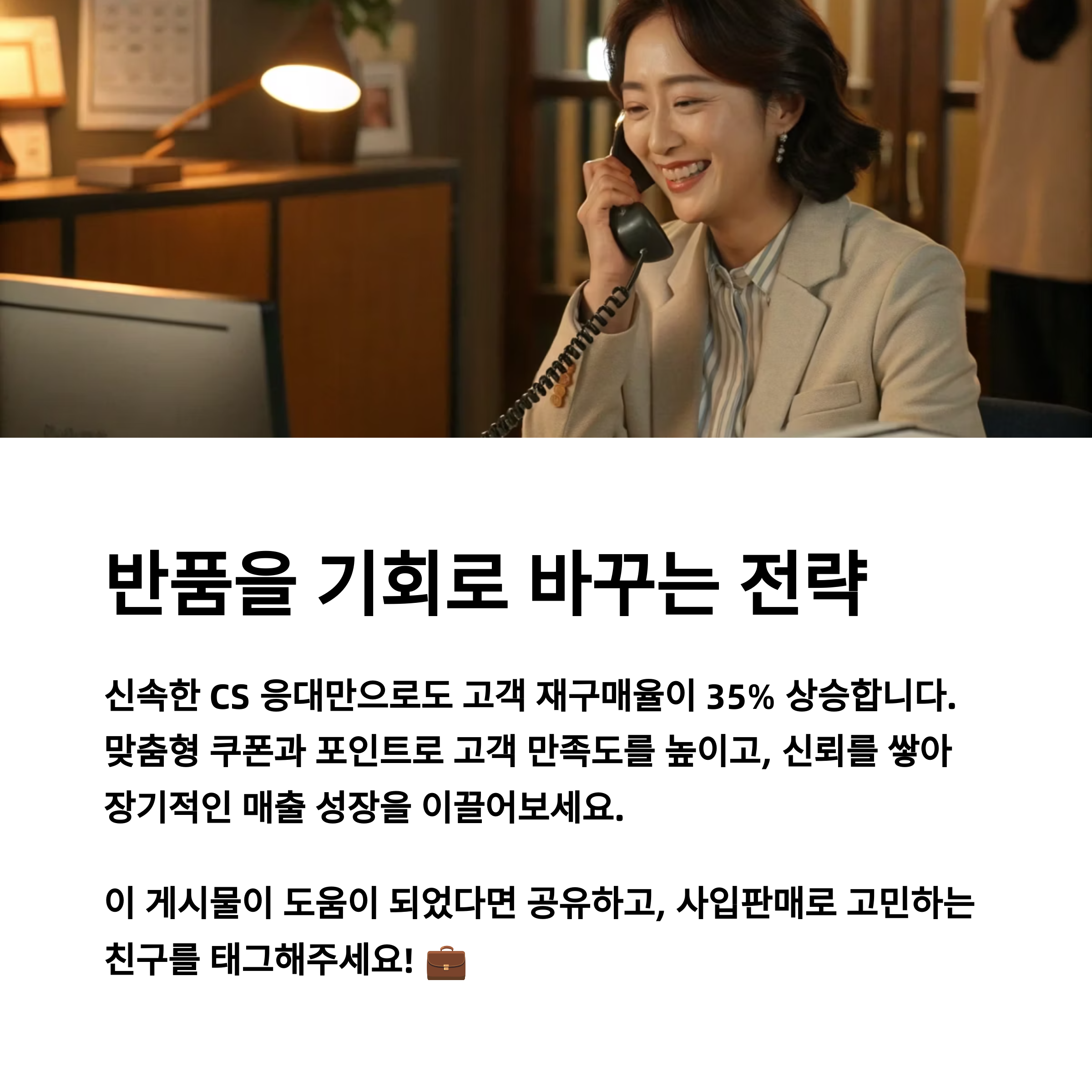 사입판매는 매출 성장과 수익 극대화를 위한 좋은 전략이지만, 반품이라는 현실적인 문제를 함께 안고 갑니다. 하지만 우리는 그 문제를 두려워할 필요가 없습니다. 오히려 반품은 내 비즈니스의 완성도를 높이는 기회가 될 수 있습니다. 정확한 정보 제공, 체계적인 응대, 그리고 고객과의 신뢰를 쌓는 과정 속에서 반품은 고객 경험의 일환이자, 장기적인 성장을 위한 발판이 될 것입니다. 결국 중요한 것은 준비된 셀러가 되는 것입니다.