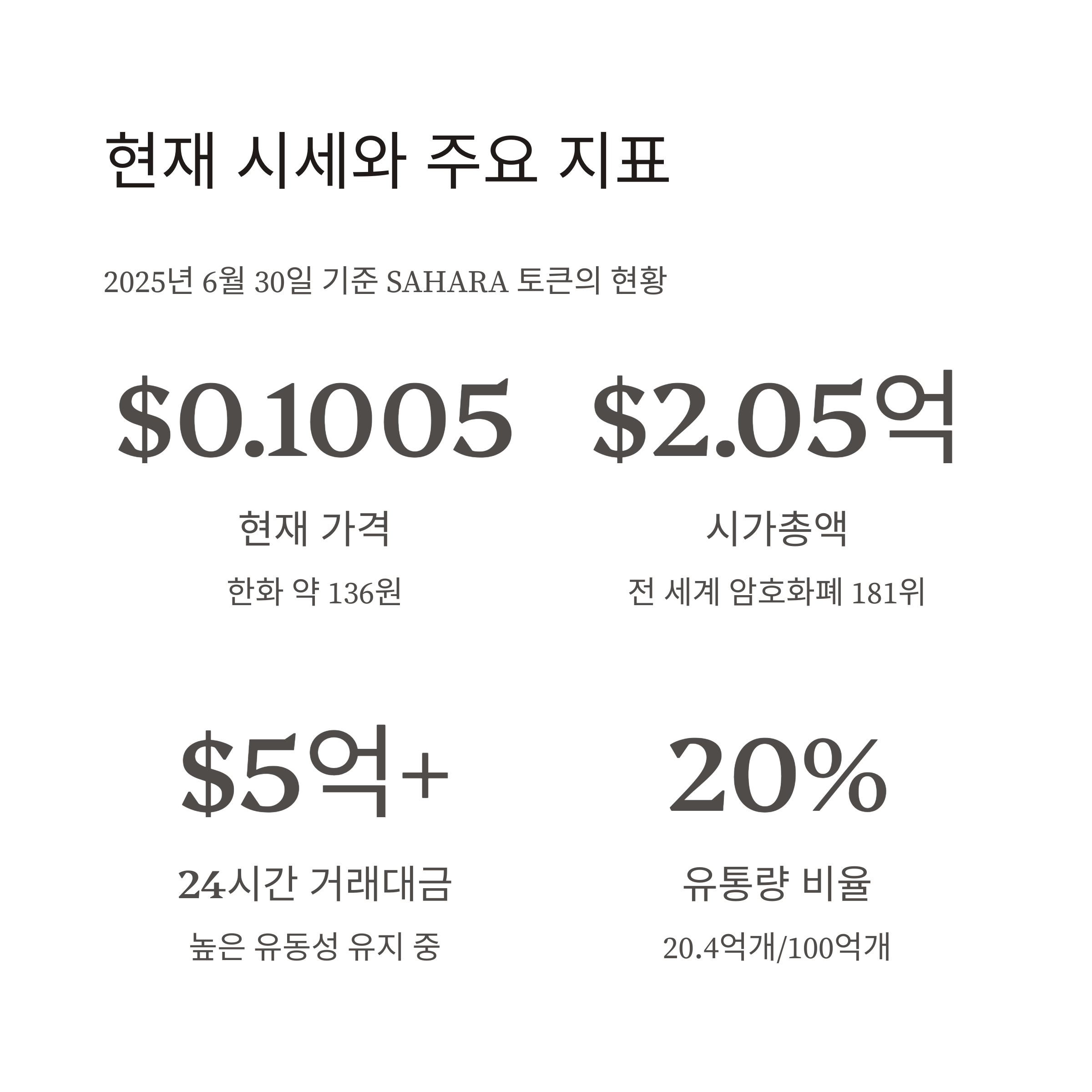 2025년 6월 30일 기준 SAHARA 토큰의 가격은 약 $0.1005(한화 약 136원)으로,