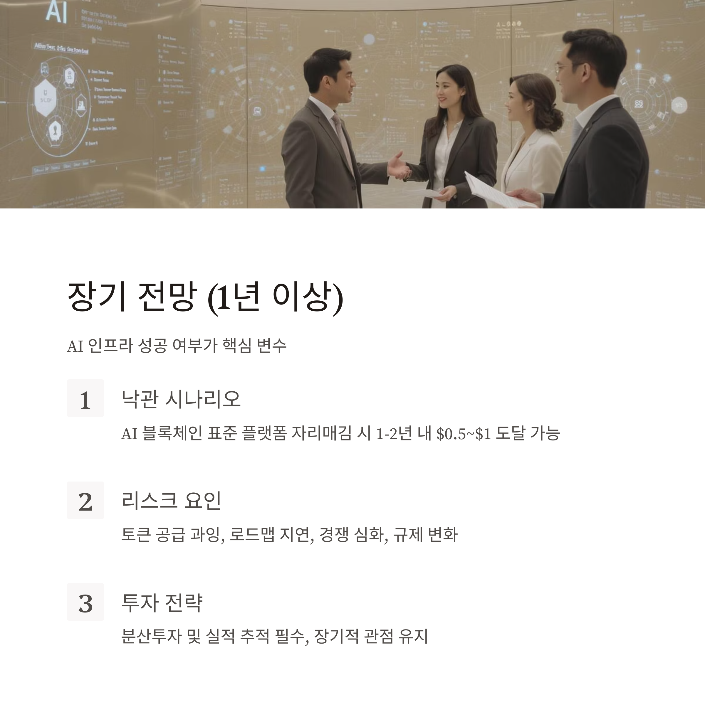 | 주요 리스크 | 토큰 언락, 기술 일정 지연, 규제, 경쟁 강화 |
