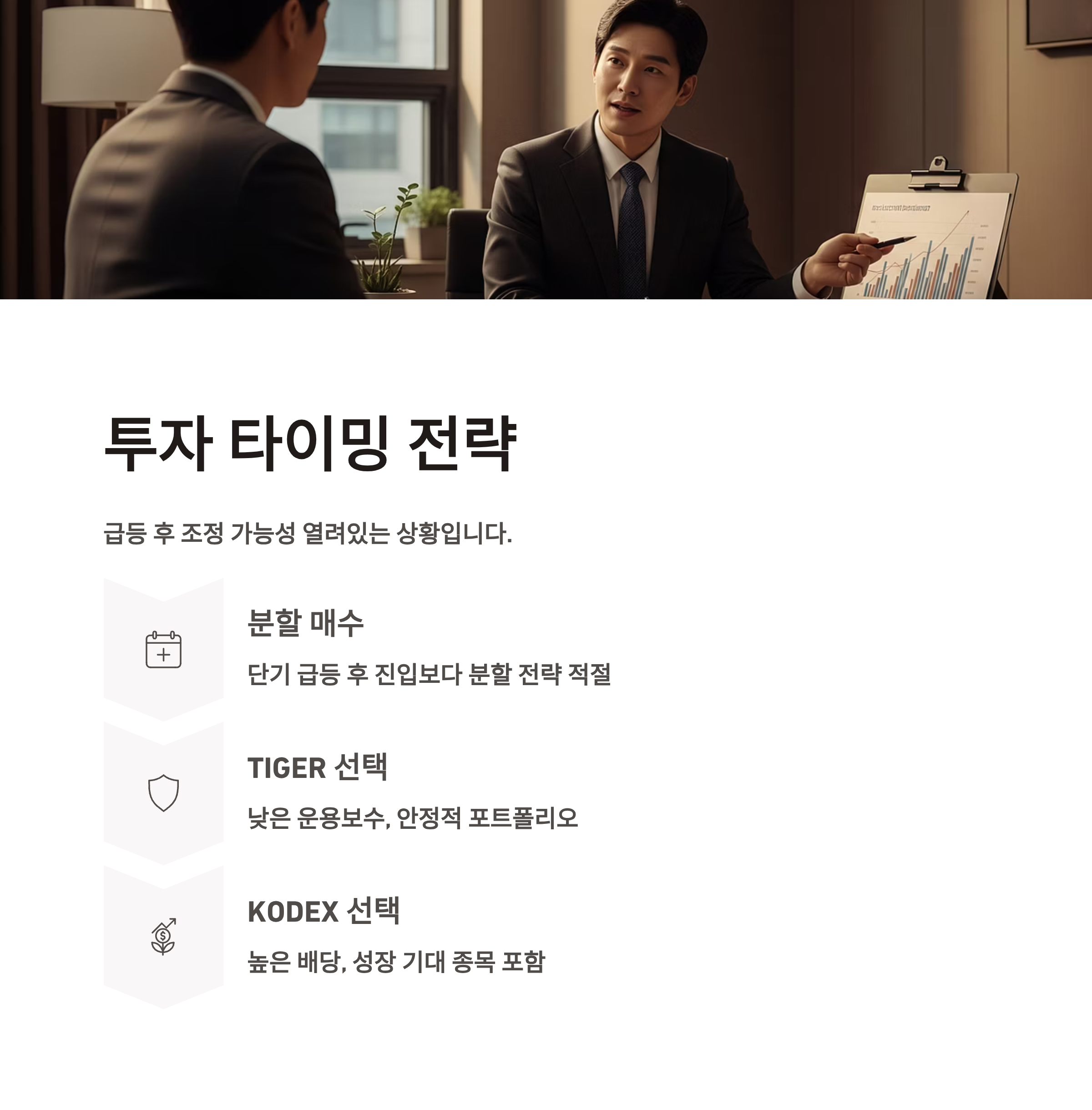 최근 급등 이후 조정 가능성도 열려 있는 상황입니다. 이럴 땐 단기 급등 후 진입보다는 분할 매수 전략이 더 적절할 수 있습니다. 특히 TIGER는 낮은 운용보수와 안정적인 포트폴리오를, KODEX는 높은 배당과 성장 기대 종목을 가진 만큼 투자 목적에 따라 전략을 세워야 합니다.