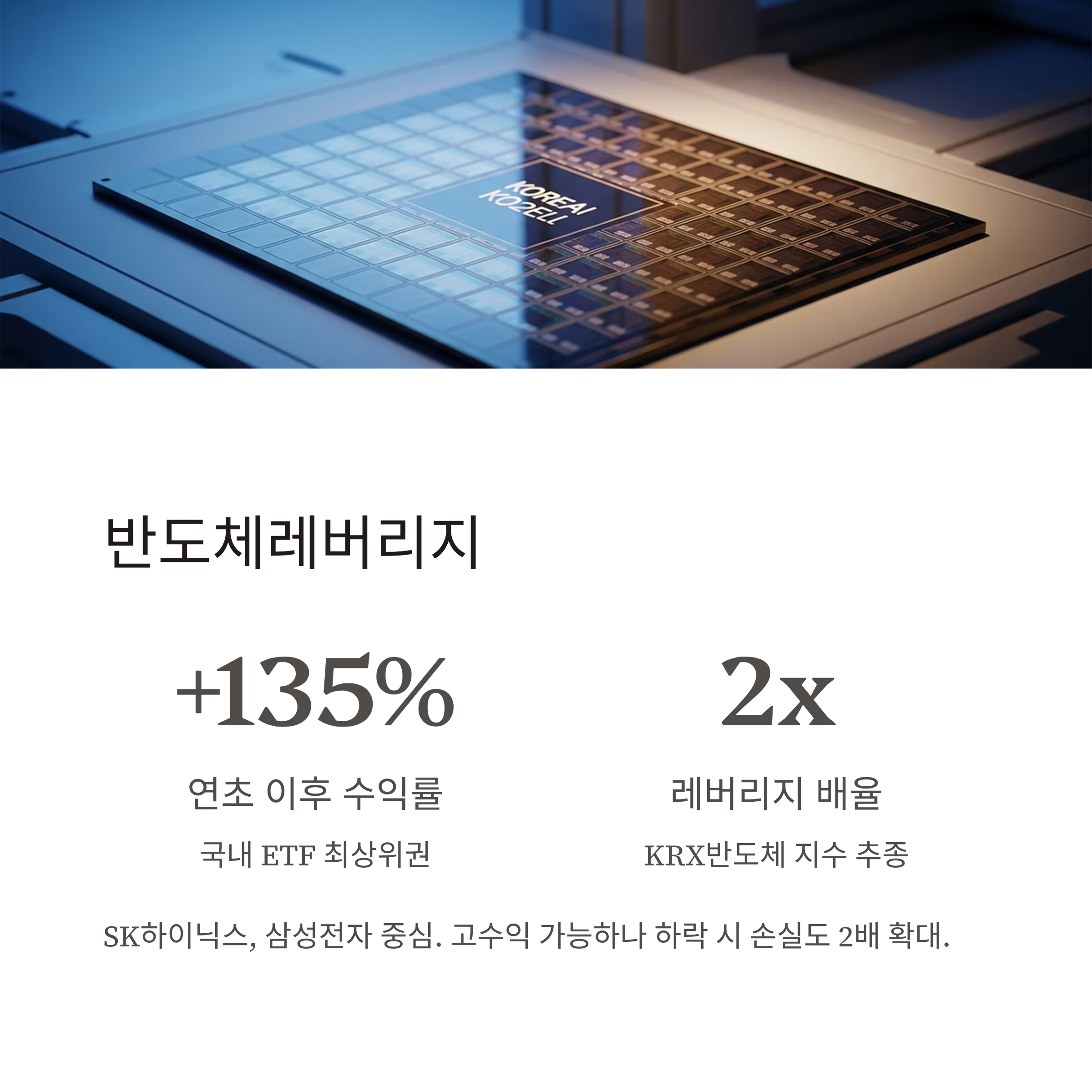 | 반도체레버리지 | +135.6% (YTD) | 약 0.49% | KRX반도체 지수 2배 추종, 고수익/고위험 구조 |