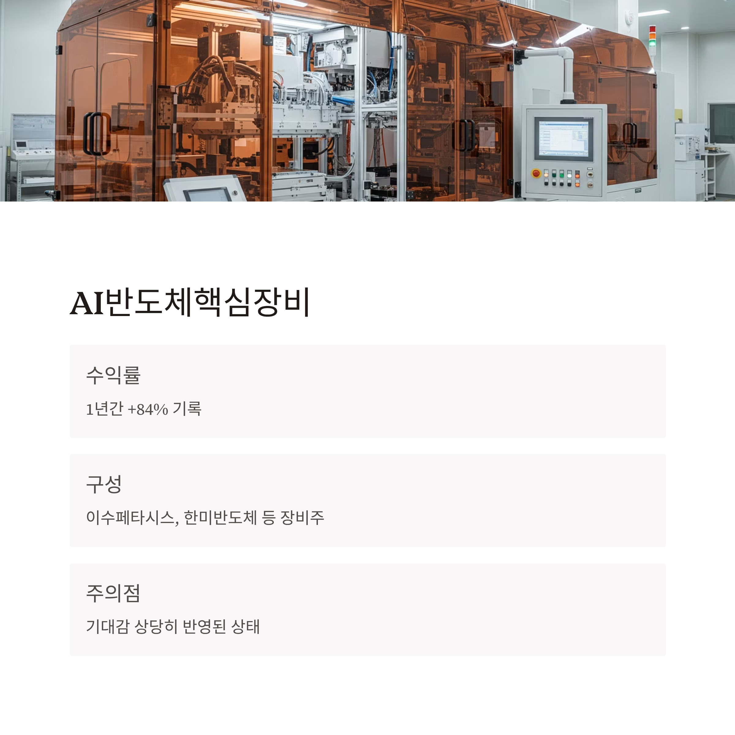 | AI반도체핵심장비 | 약 +84.01% | 약 0.39% | 반도체 장비주 테마, 고성장 섹터 |