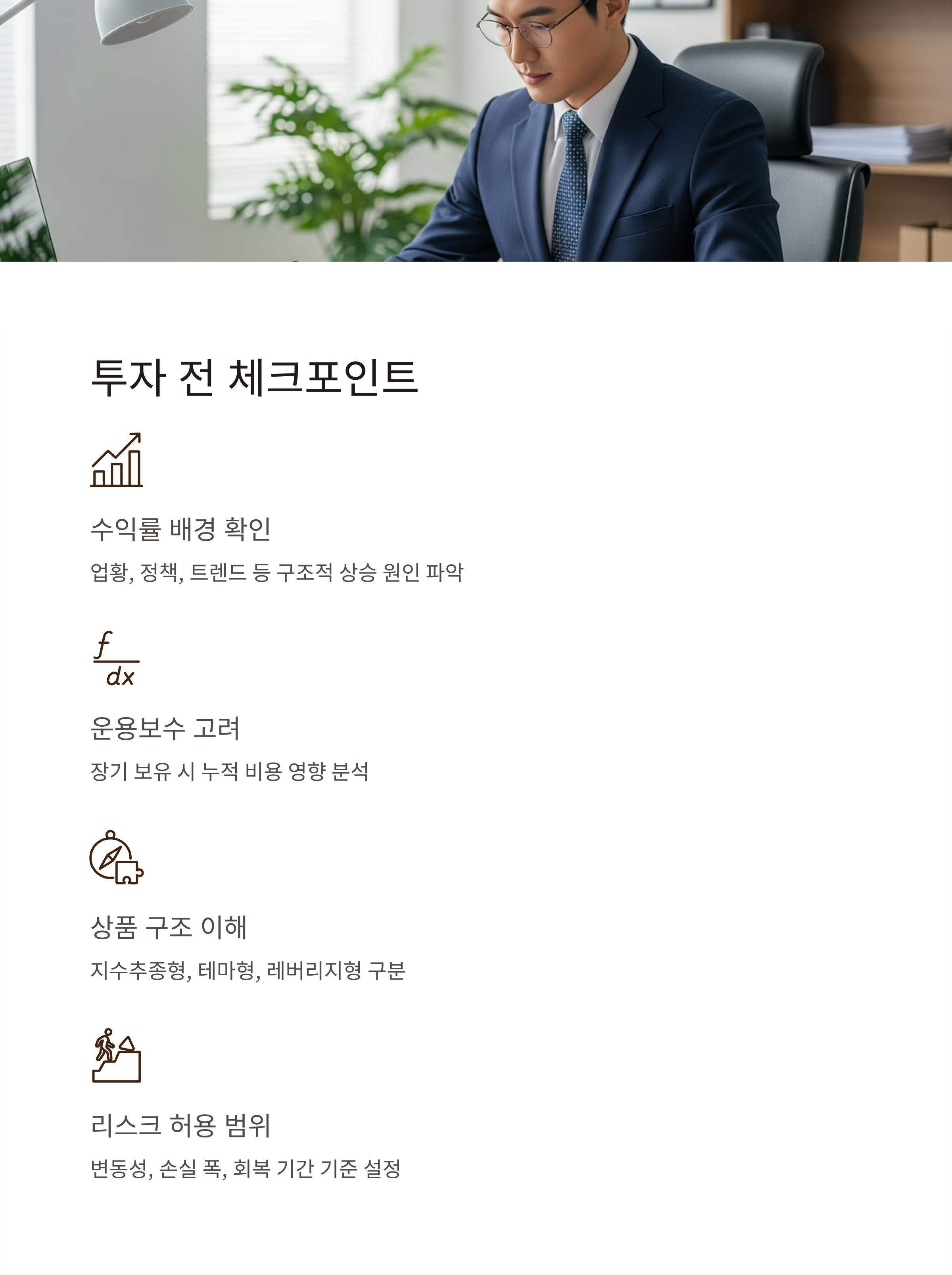 | 투자 전략과 상품 구조 | 지수추종형, 테마형, 레버리지형 등 상품 구조 파악 필수 |
