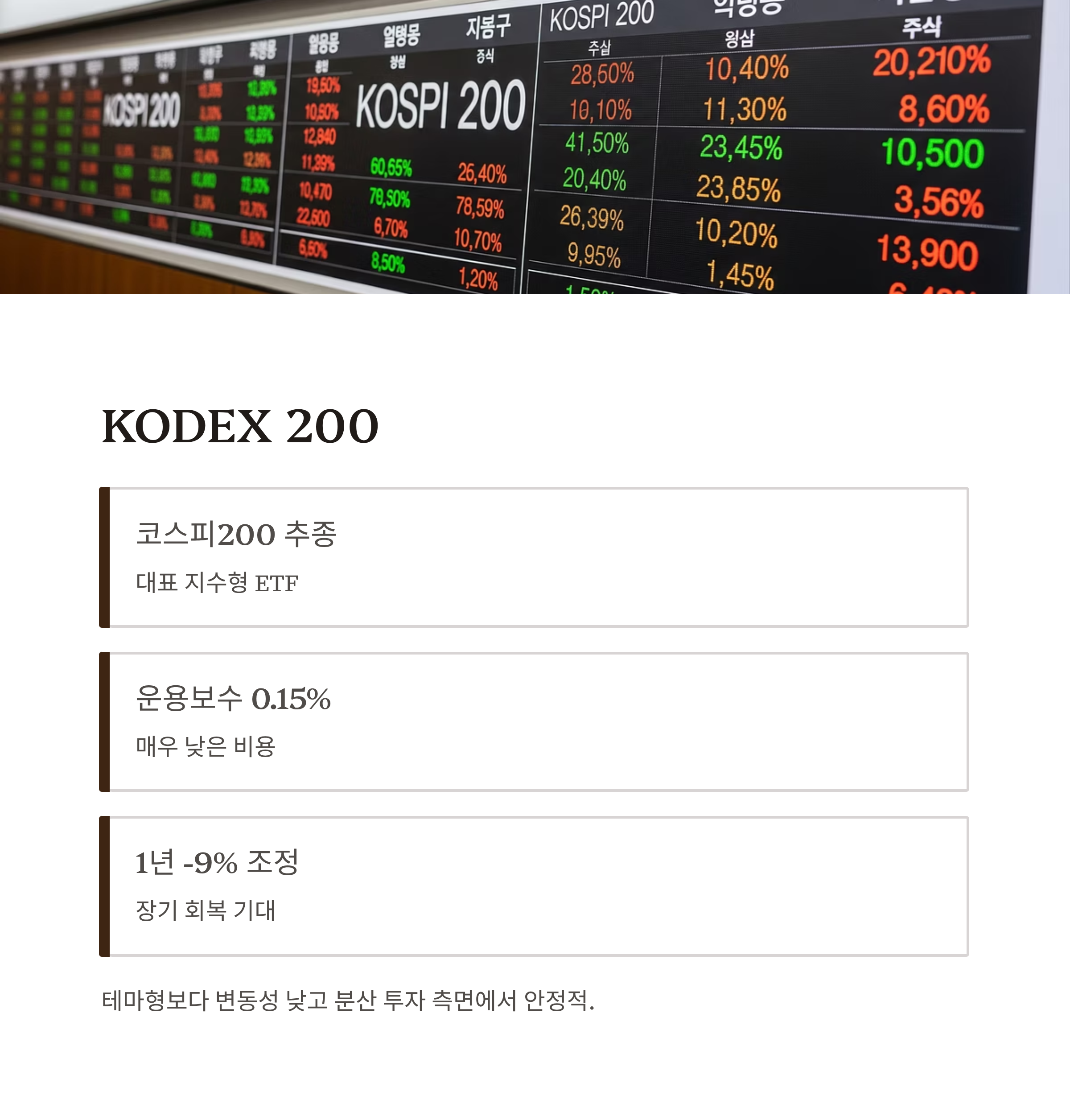 | KODEX 200 | 약 -9.12% | 약 0.15% | 코스피200 지수 추종, 분산 투자용 |