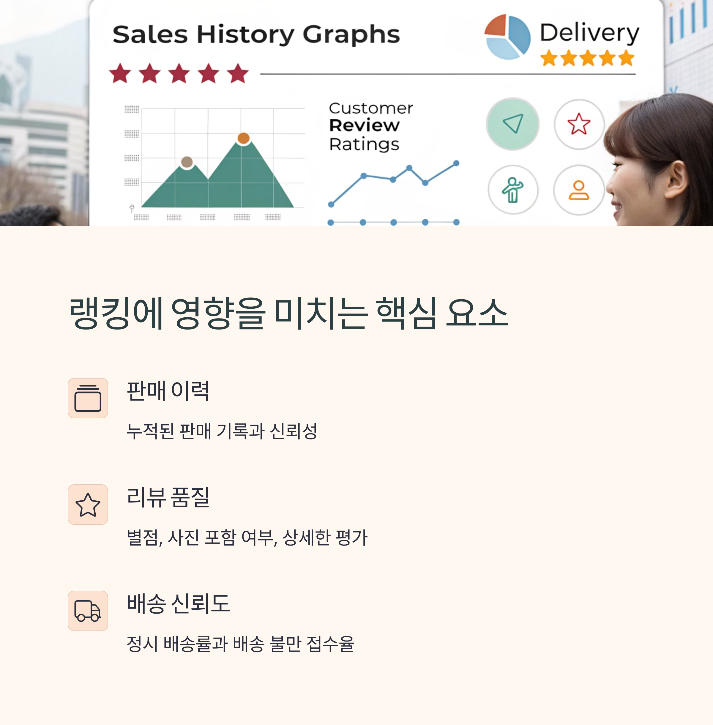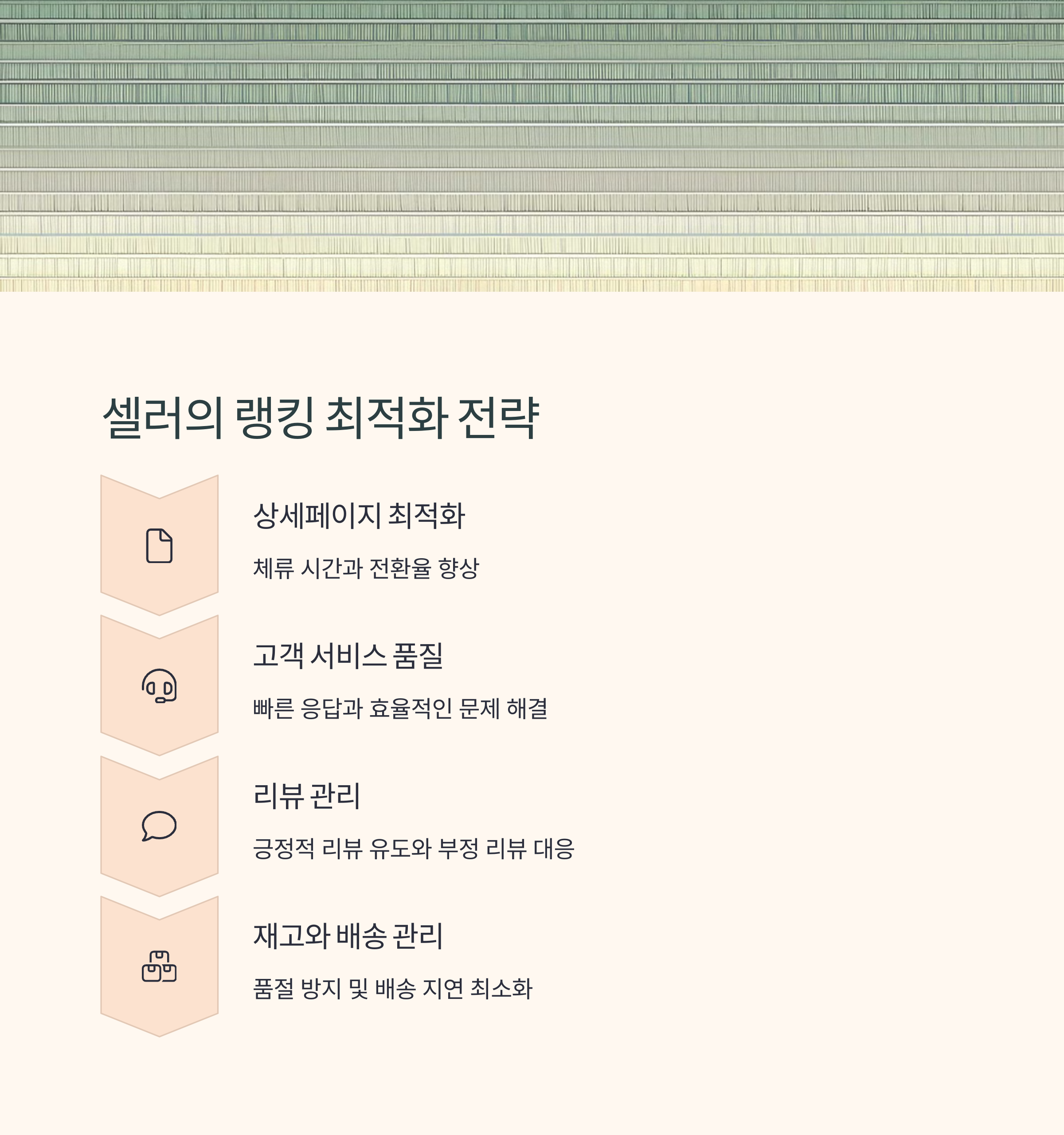 | 판매 성과와 리뷰 품질 기반 노출 | 클릭율, 응답률, 배송속도 등 반영 | 상세페이지 개선과 운영관리 필수 |