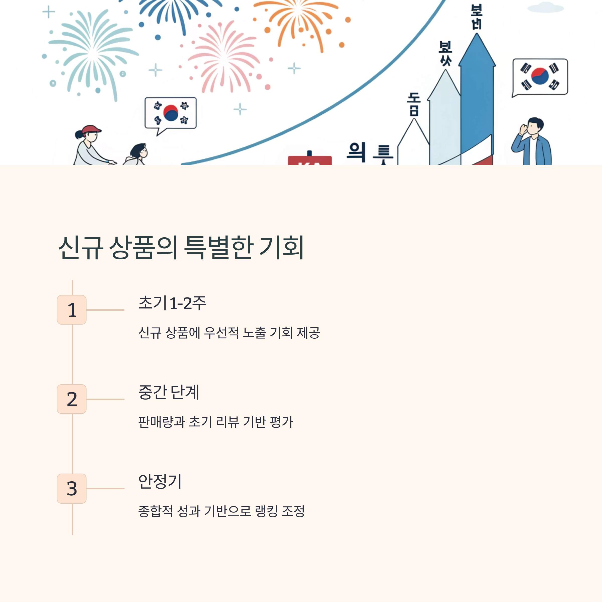| 신규 상품엔 초기 노출 버프 존재 | 부정적 후기 누적 시 하락 가능 | 경쟁 상품 대비 강점 어필 중요 |