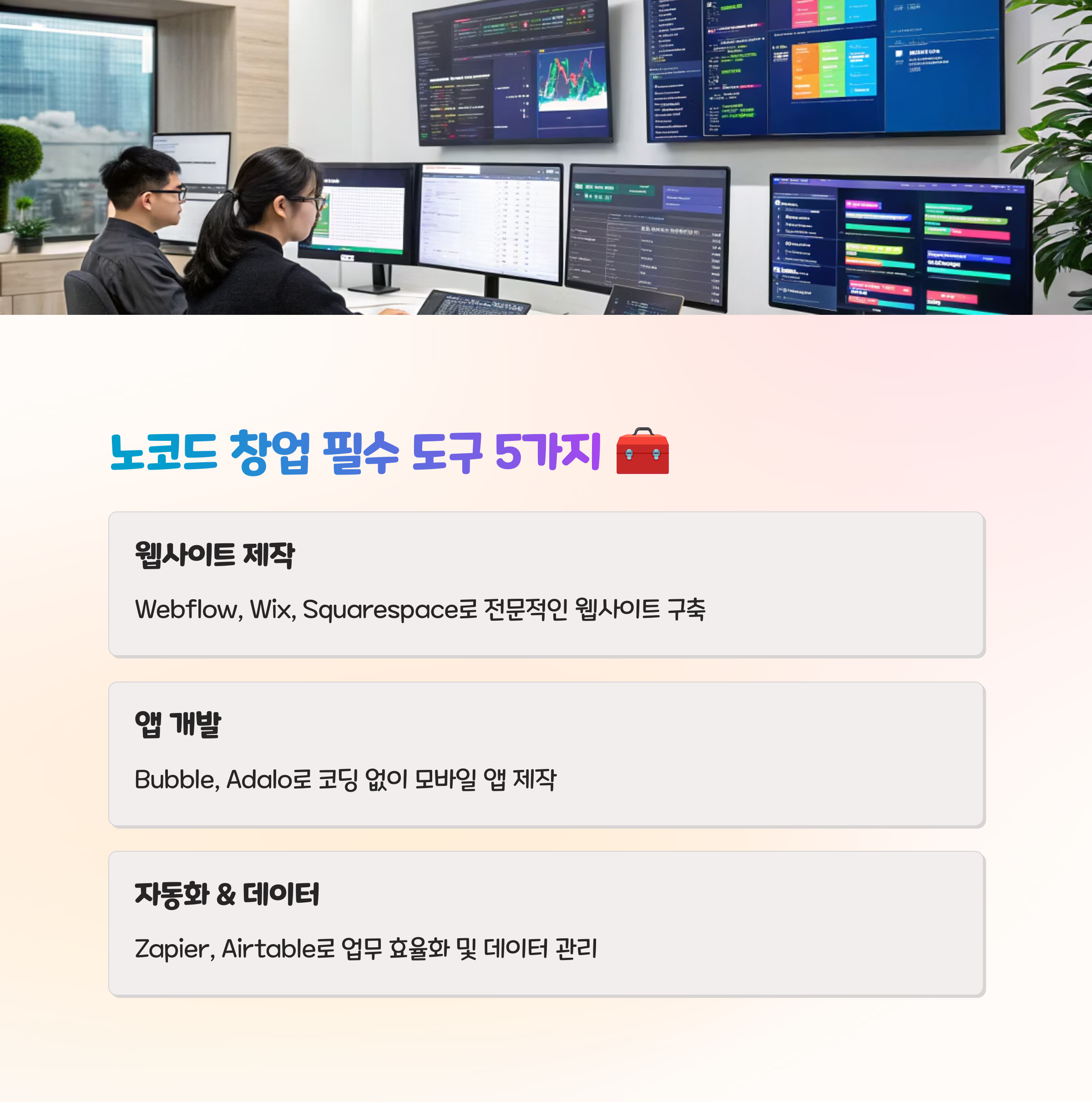 | 대표 도구: Glide, Bubble, Notion | 혼자서도 충분히 운영 가능한 구조 | 반복적인 테스트와 사용자 피드백 필수 |