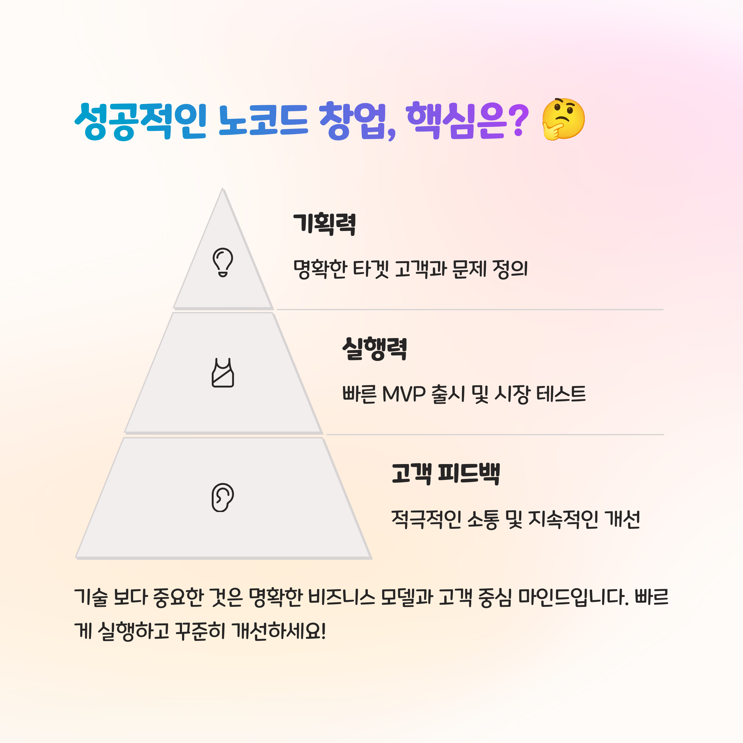 노코드 창업은 기술 중심이 아닌 기획력 중심의 접근이 핵심입니다. 누구나 아이디어만 있으면 도전할 수 있는 환경이 마련되었기에, 중요한 건 실행의 속도와 고객과의 소통입니다. 작게 시작해 빠르게 반응을 확인하고, 필요한 기능을 덧붙여나가는 방식이 가장 현실적이며 성공 가능성이 높습니다.