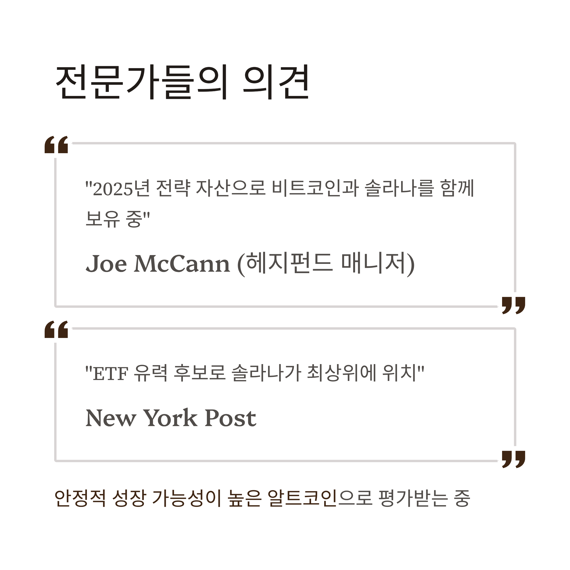 - Joe McCann (헤지펀드 매니저): “2025년 전략 자산으로 비트코인과 솔라나를 함께 보유 중.”