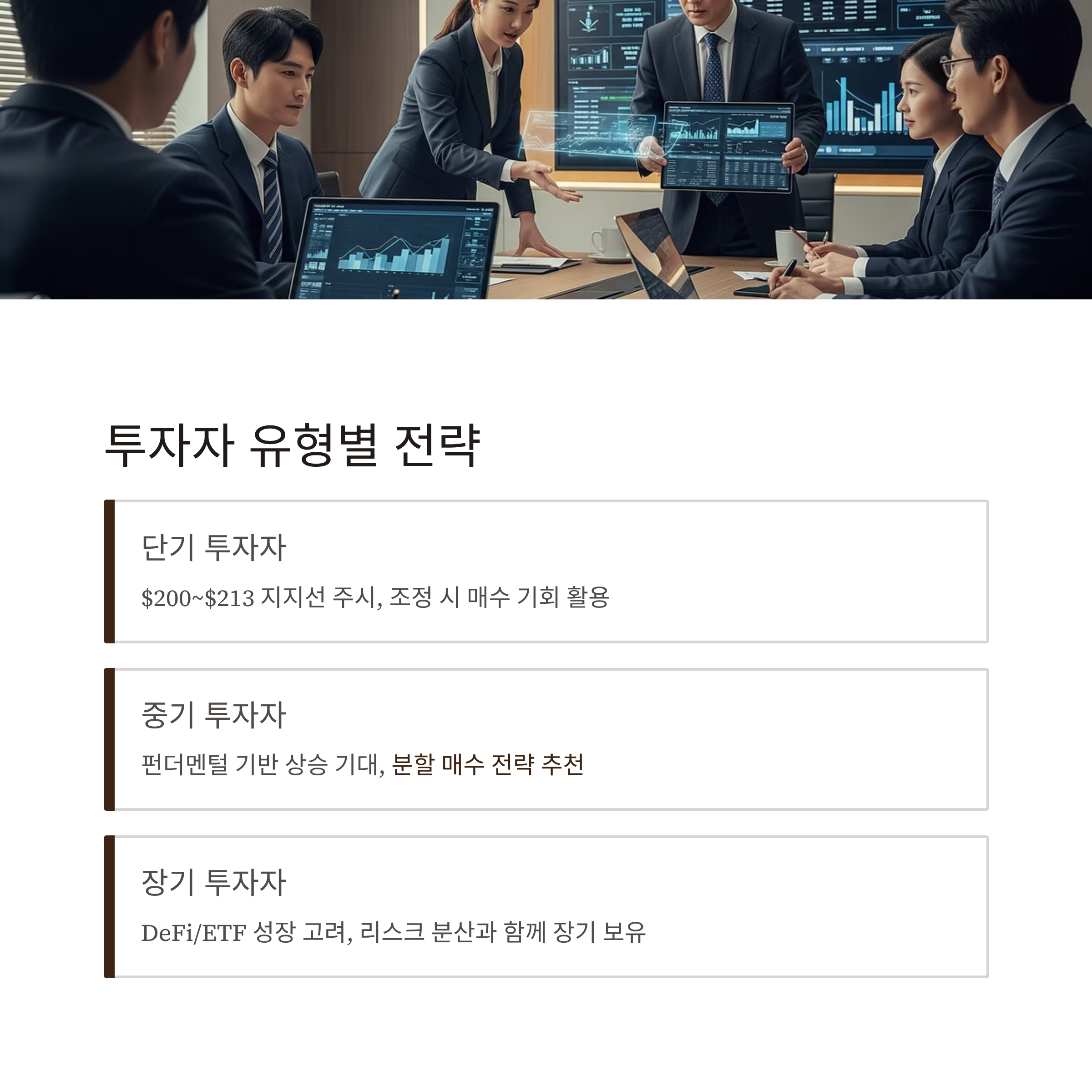| 단기 투자자 | $200~$213 지지선 주시, 조정 시 단기 매수 가능 구간 활용 |