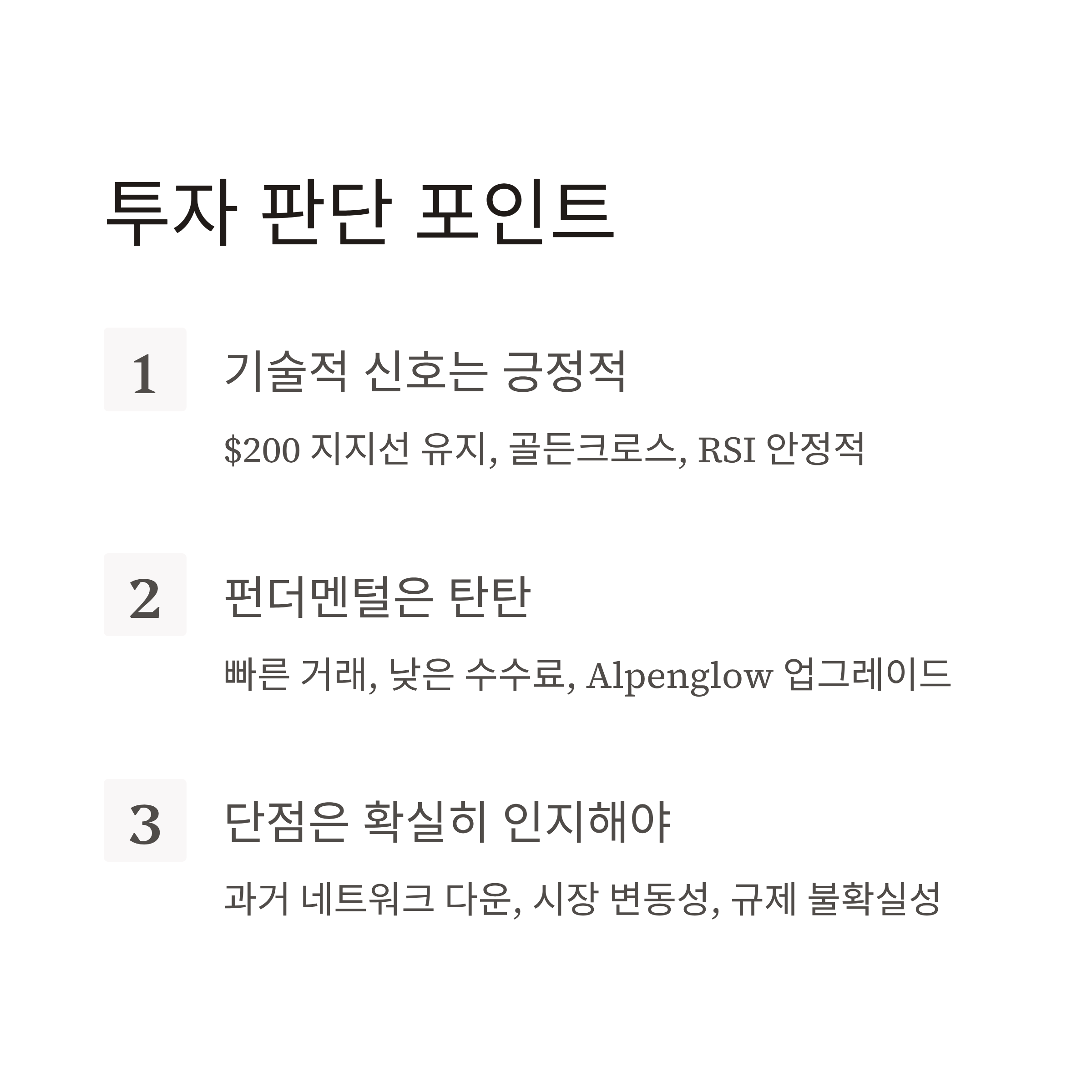 - $200 지지선 유지, 골든크로스, RSI 안정적